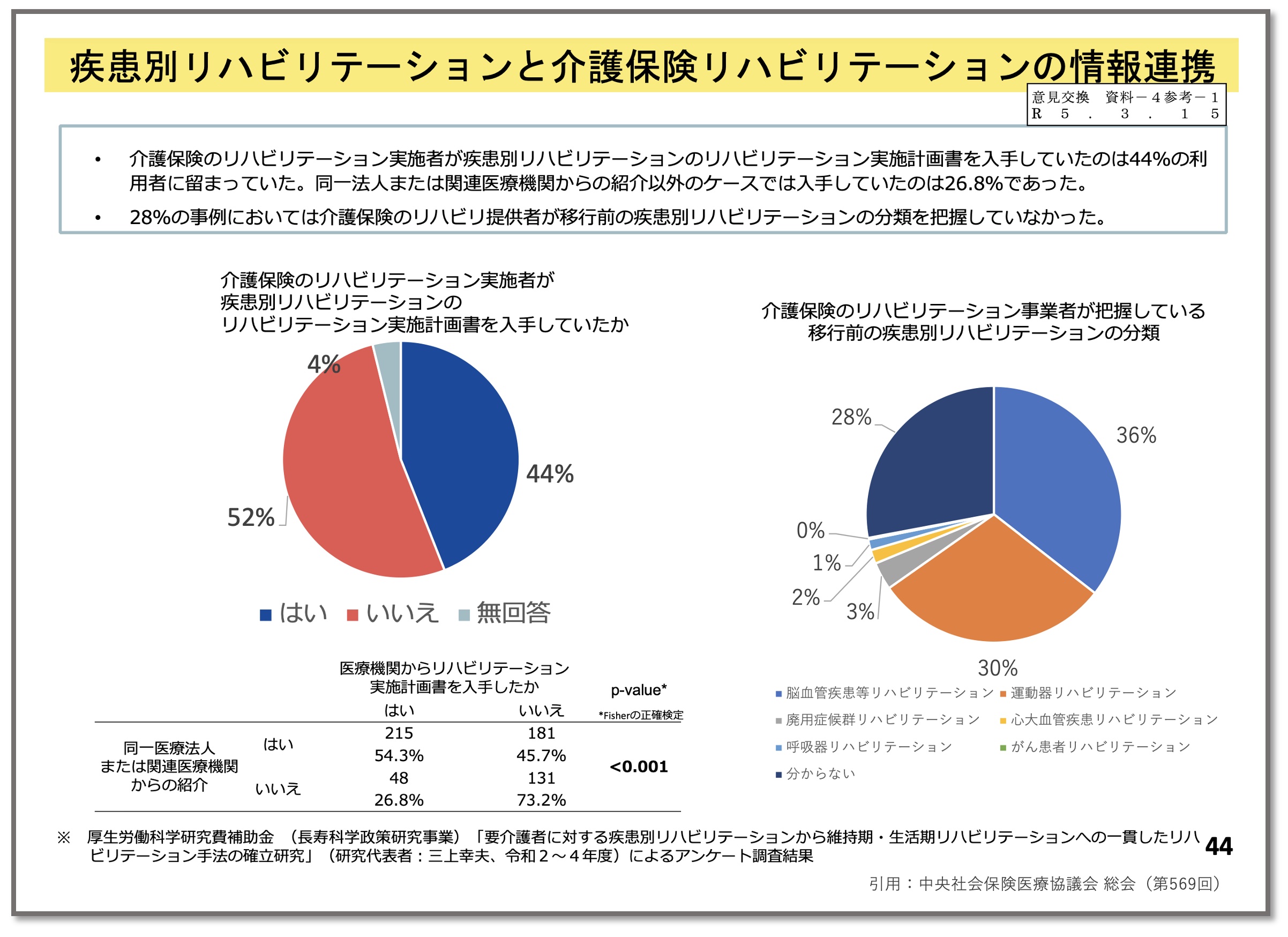 ○ 保険医療機関から介護保険事業所へのリハビリテーション実施計画書の提供が半分以下に留まっている実態を踏まえ、医療・介護連携を推進するための情報連携の評価の在り方として、リハビリテーション実施計画書を提供することを疾患別リハビリテーション料の通則に位置づけること及び退院時共同指導料2の共同指導に参加する職種に老健・介護医療院等の訪問リハビリテーション事業所の医師・理学療法士等が参加することが望ましいことを明確化することについて、どのように考えるか。引用:中央社会保険医療協議会 総会(第569回) 個別事項(その10)について