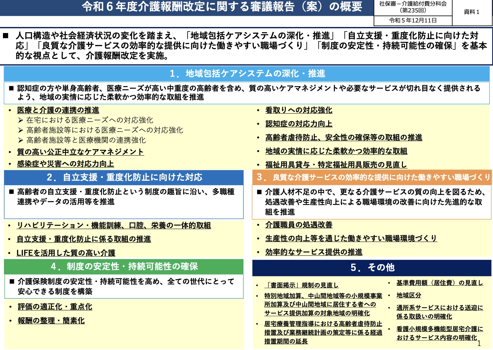 厚生労働省は11日、令和6年度介護報酬改定に関する審議報告(案)を介護給付費分科会に提示した。