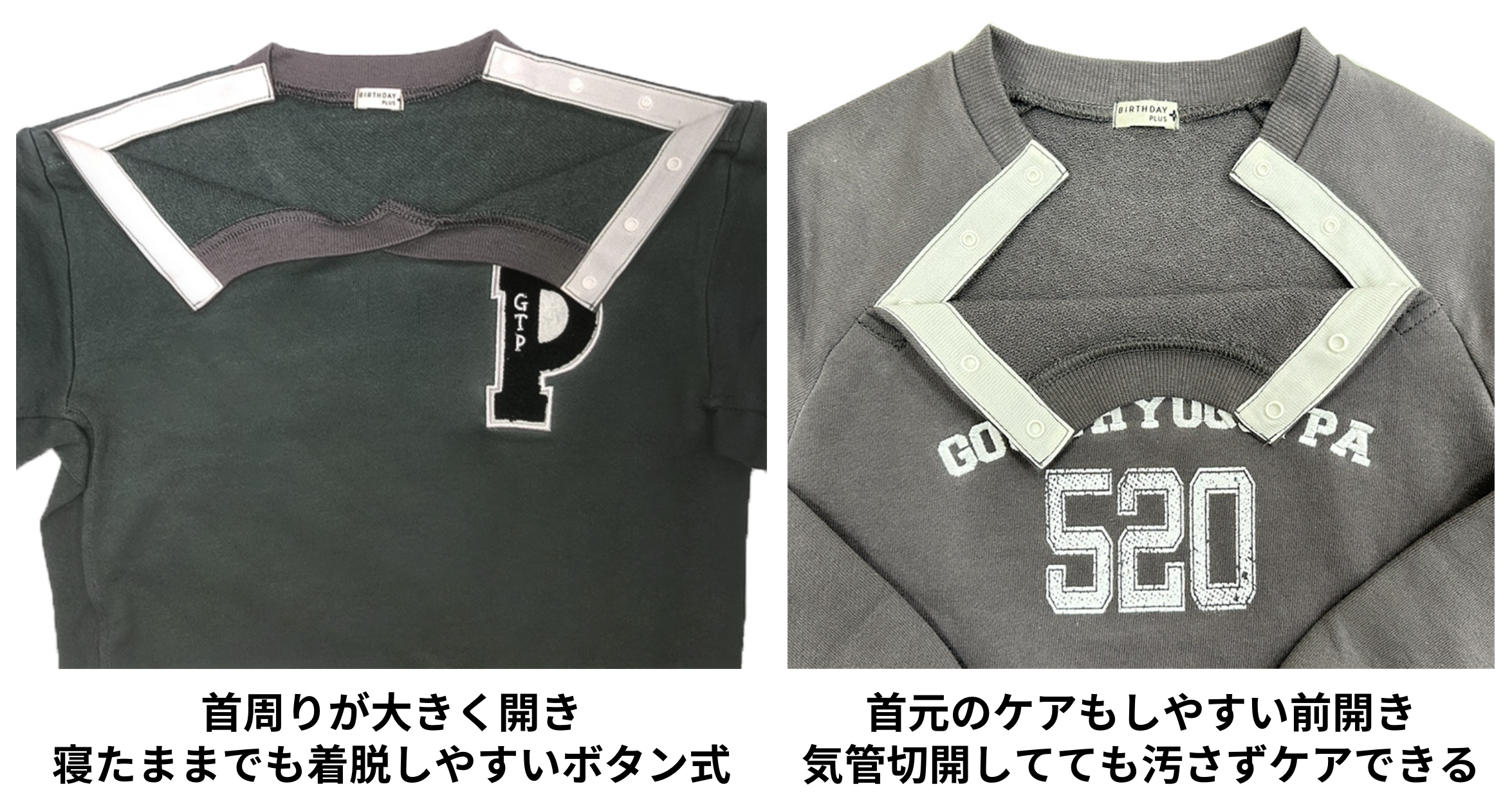 気管切開をしていたり、寝たまま着替えをする子どもを考慮し、首周りが大きく開き、下から着られるボタン式のデザインや首元をVネックにする工夫をしました。