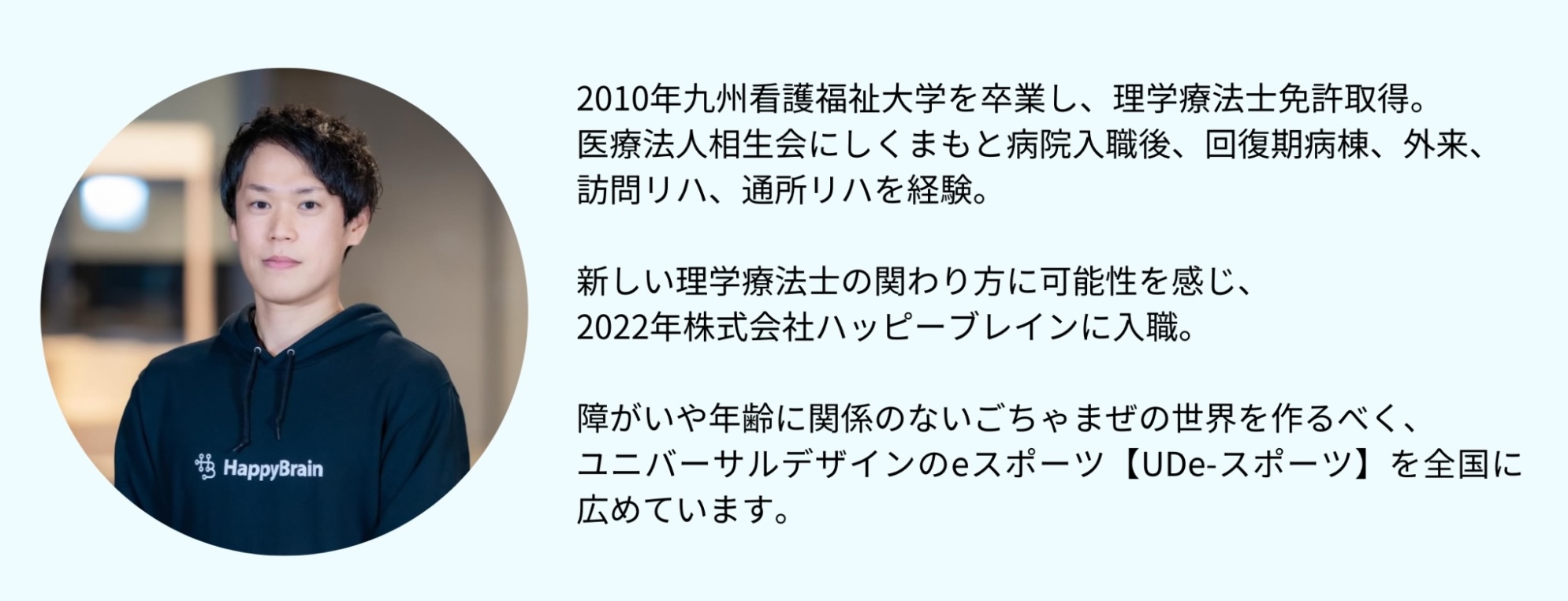 今回、eスポーツを誰もが、簡単に楽しめるように開発された「UDe-スポーツ」について、eスポーツのプレイサポートを行う株式会社ハッピーブレインの理学療法士・矢元さんにお話を伺いました。