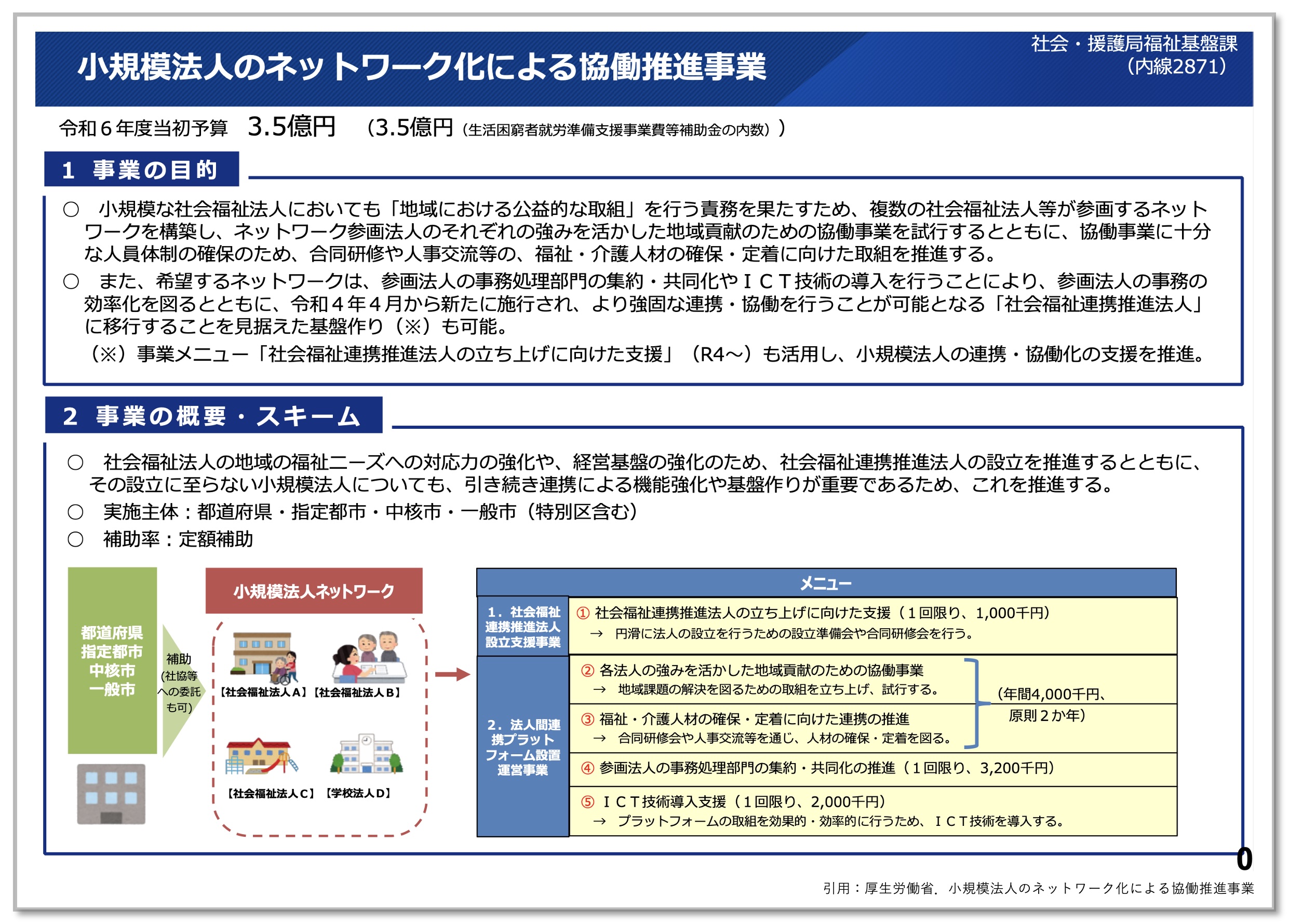 実行段階については、小規模法人のネットワーク化による協働推進事業、社会福祉連携推進法人の立ち上げに関する事業概要の資料が公開された。