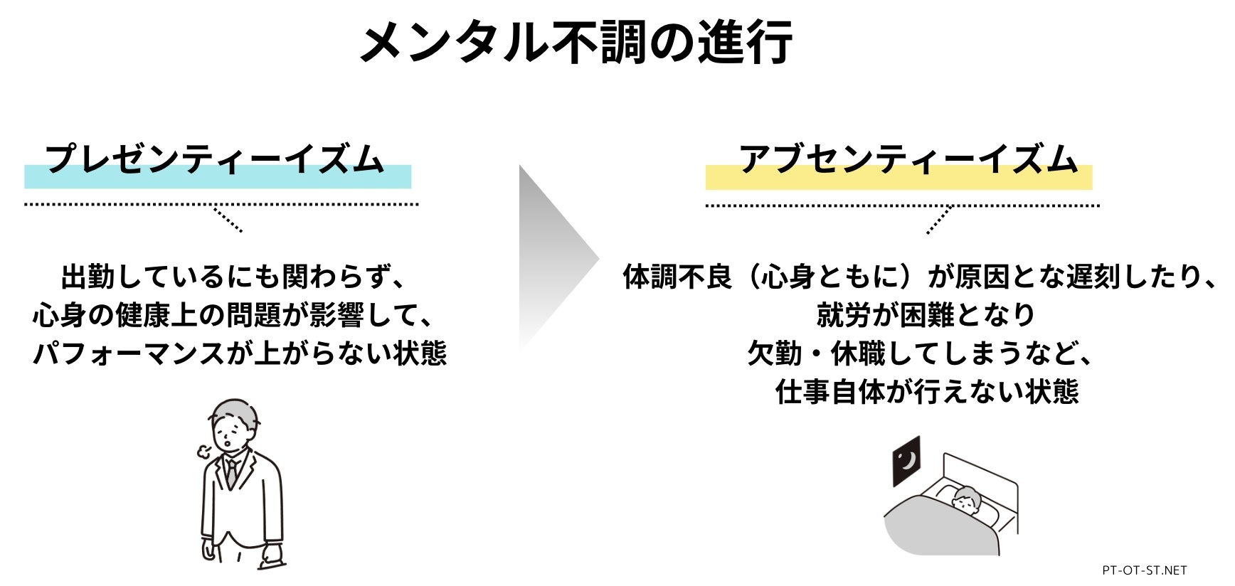 メンタル不調の進行は、「プレゼンティーズム」と「アブセンティーズム」の二つに分けられます。プレゼンティーズムは「出勤できているから気づきにくい」と言われ、要注意な状態です。