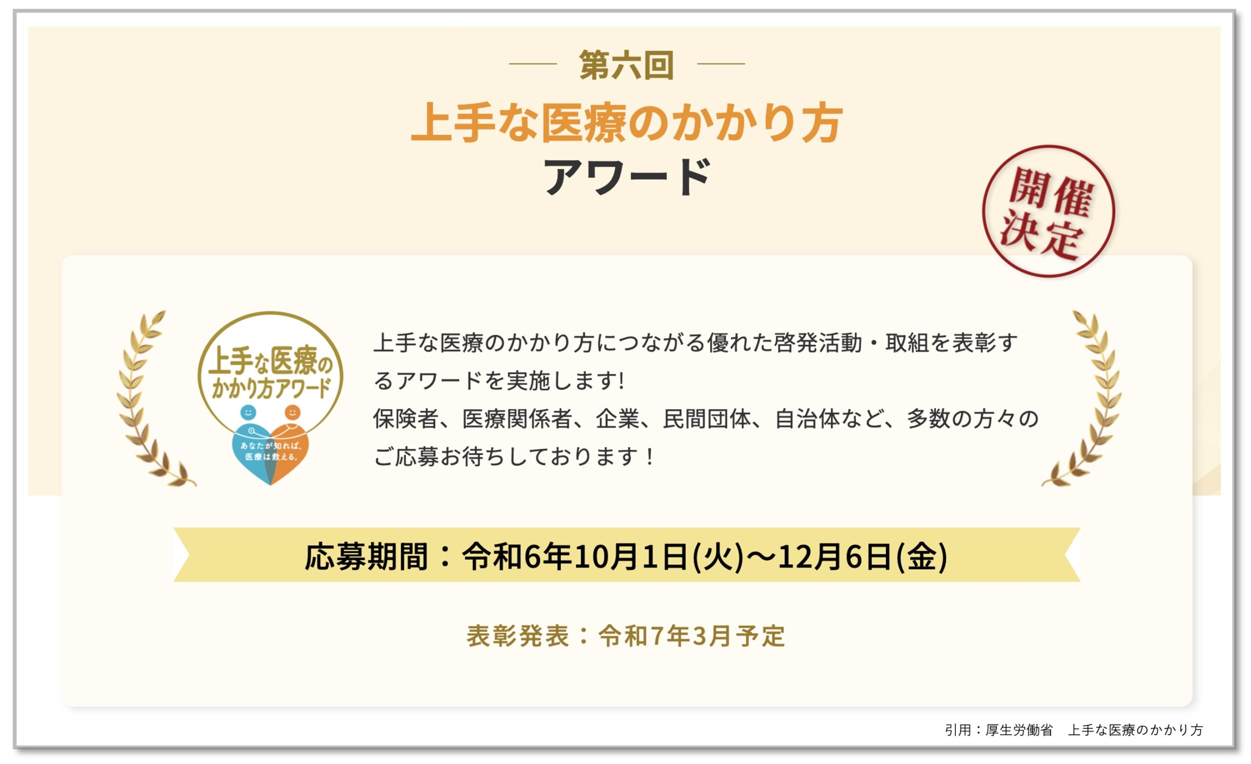 本プロジェクトでは「上手な医療のかかり方」の啓発や、医師をはじめとする医療従事者の負担軽減、若年層に対する医療受診の教育などに関する優れた取組を厚生労働省が表彰しており、第6回「上手な医療のかかり方アワード」は、2024年10月1日〜12月16日の期間中に取組みの募集を行っている。