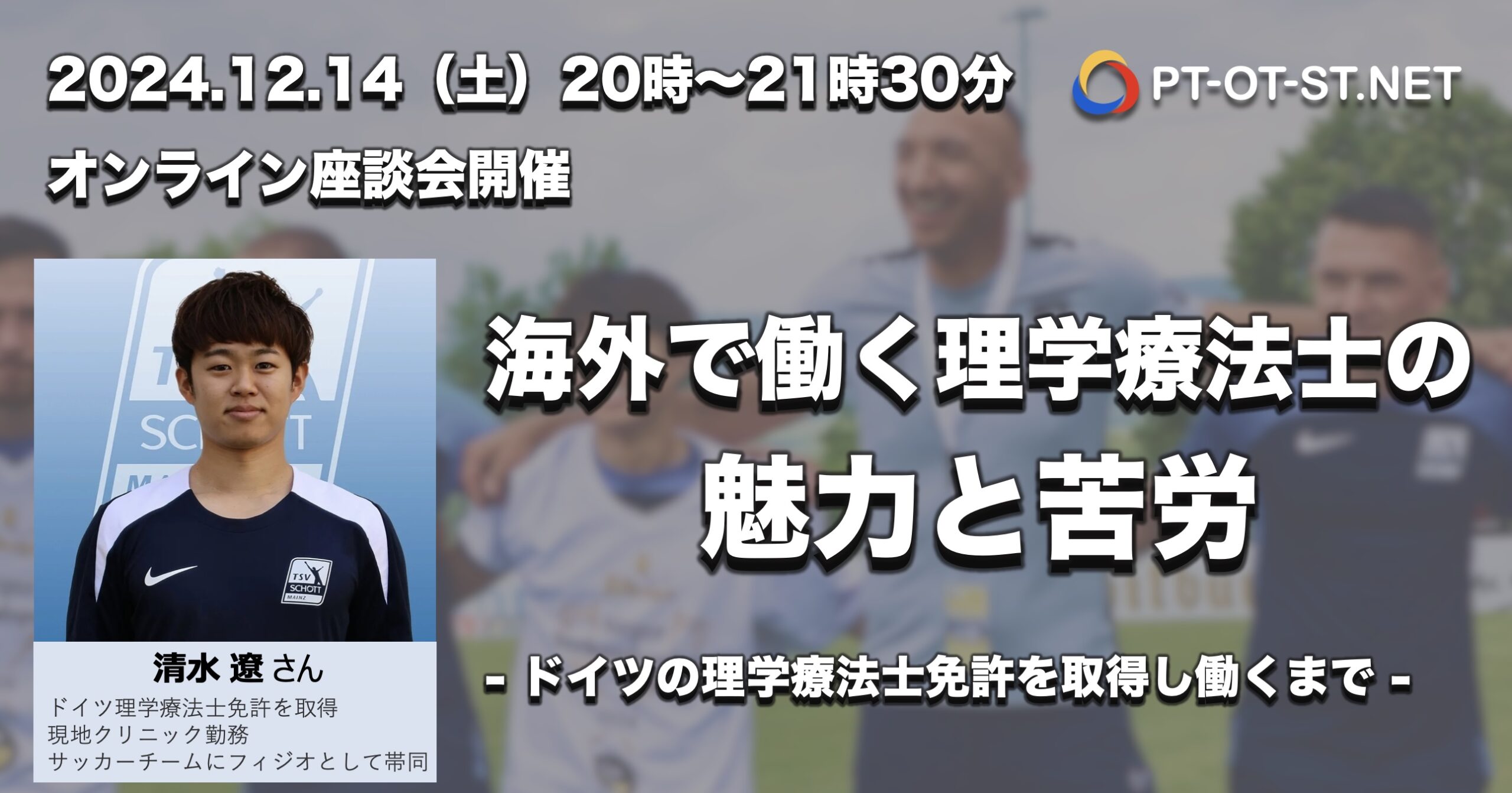 そこで今回、ドイツで活躍する理学療法士の清水遼さんをゲストにお迎えし、「海外で働く理学療法士としての魅力と苦労」についてお話しいただく座談会を開催します。