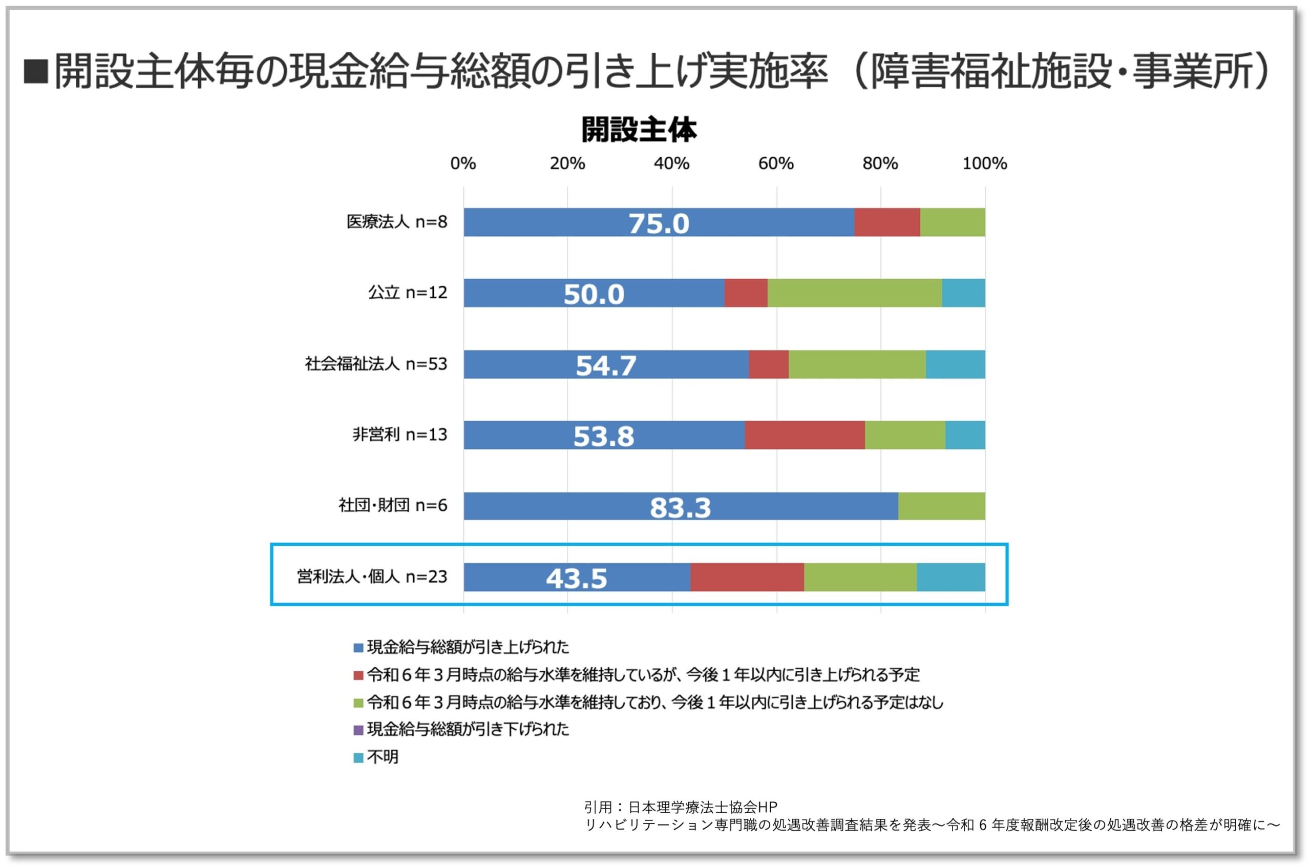 障害福祉施設・事業所は、開設主体を「営利法人・個人」とする施設において給与引き上げの実施率が43.5%と最も低値である結果が示された。