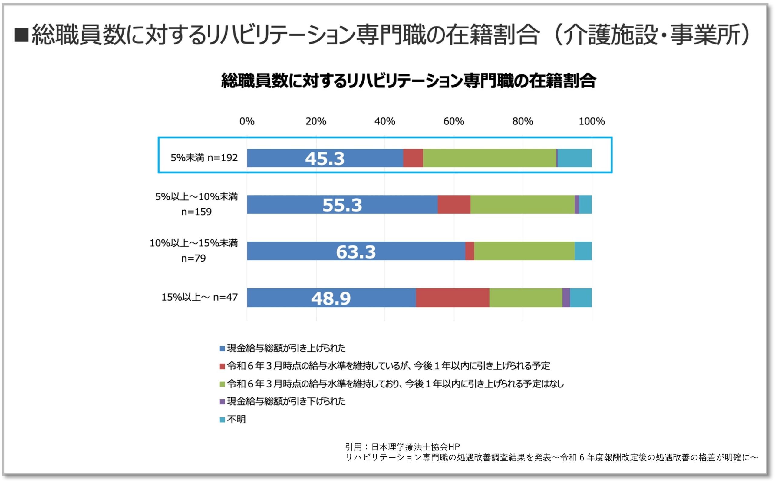 介護施設・事業所は、総職員数に対しリハビリテーション専門職の在籍割合が5%未満の施設では、給与引き上げの実施率が45.3%と最も低値であった。