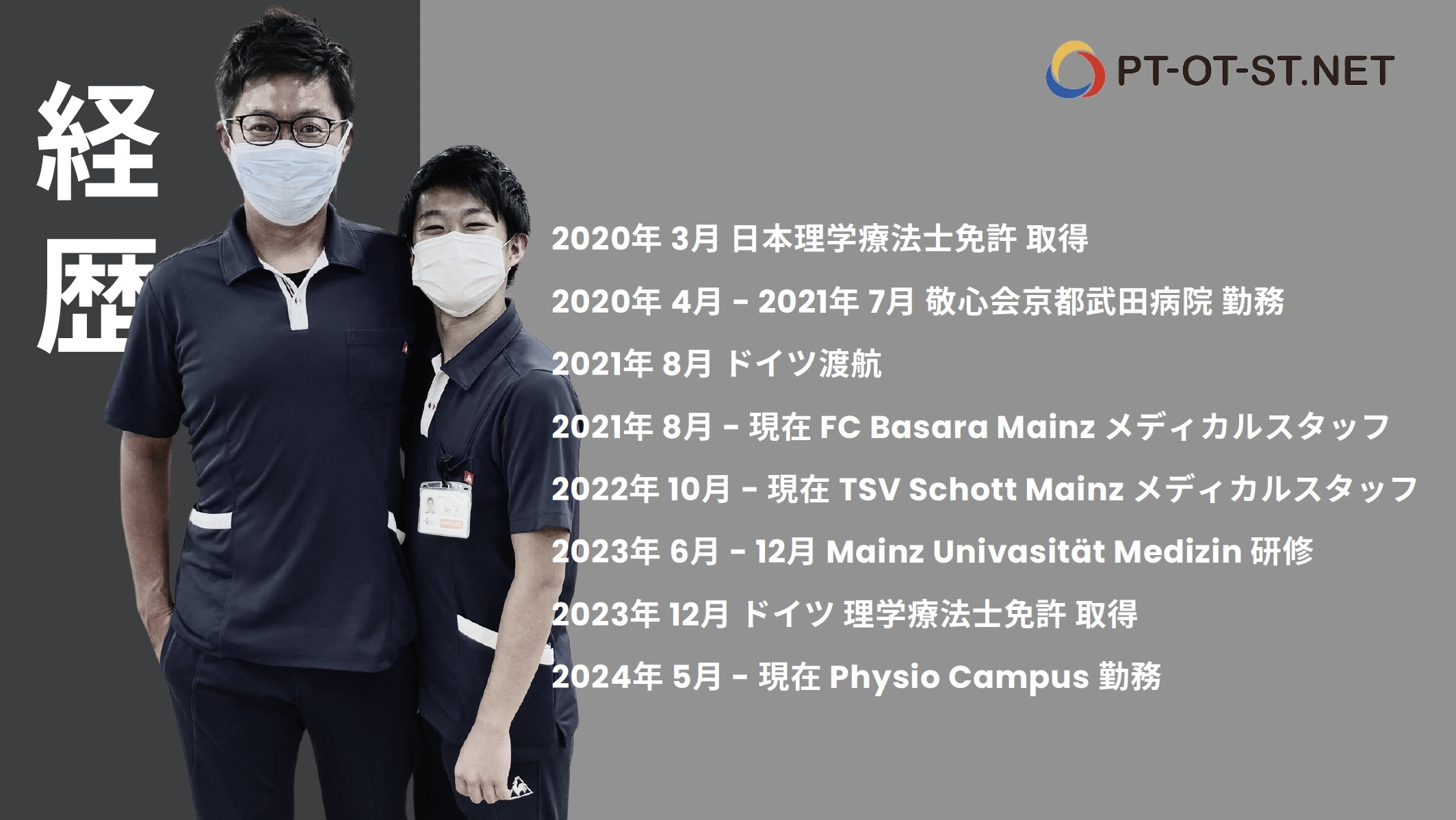 清水さん よろしくお願いします。私は日本で理学療法士免許を取得し、1年半ほど総合病院で勤めた後にドイツへ渡航しました。学生時代からスポーツ分野に関わりながら海外で働きたいと考えていたものの、なかなか行動には移せていませんでした。