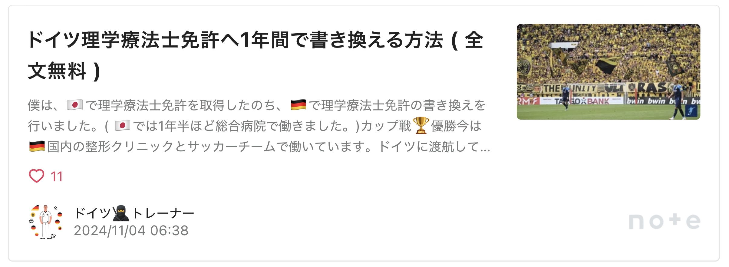 現在、ドイツ6部ですが、ブンデスリーガ3部参入を目標として、共に戦ってくれる志の高い方を募集しています。主に治療と受傷後の復帰リハビリを行います。詳細はnoteに掲載しているので興味があればぜひご連絡ください!