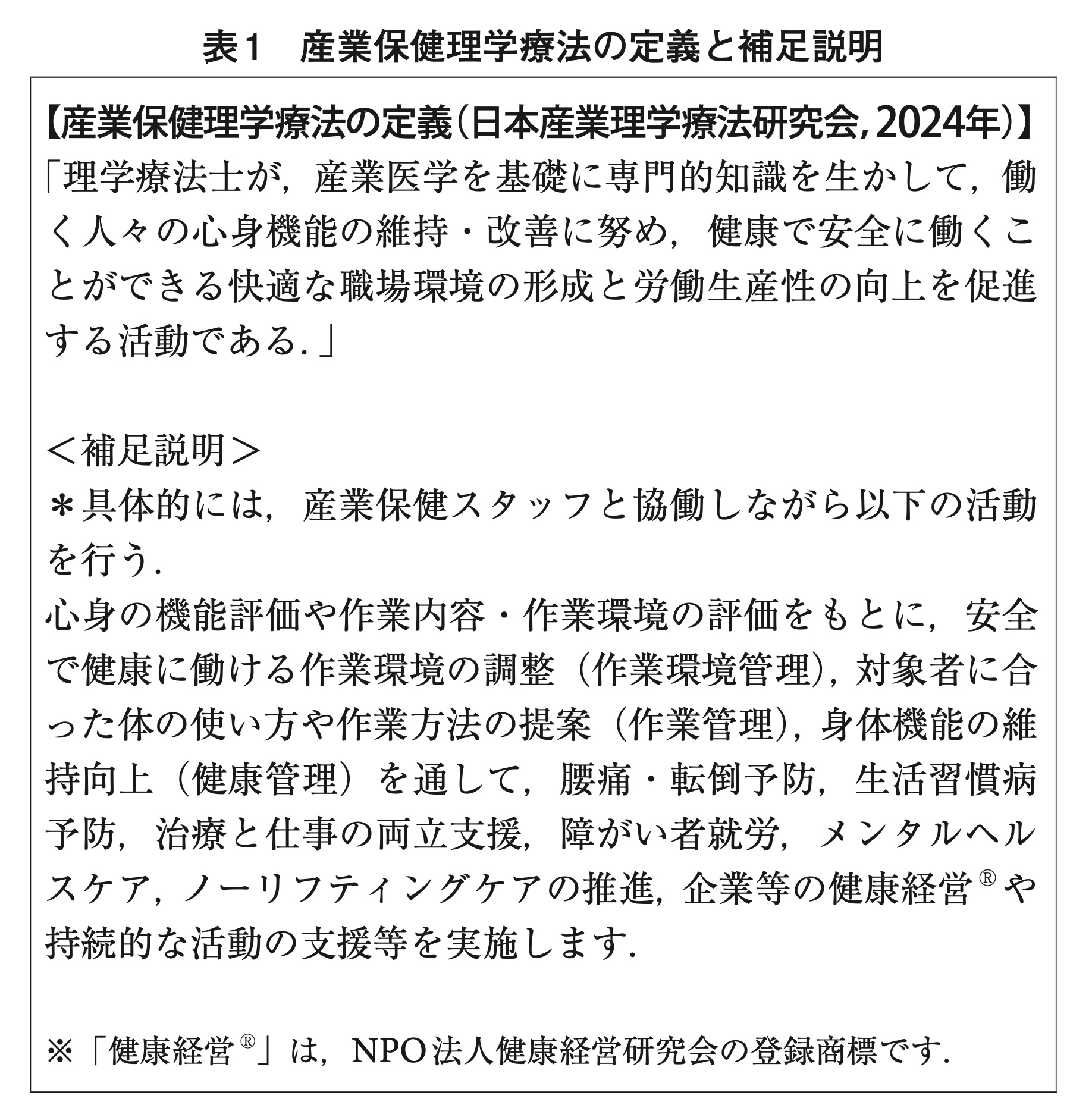 日本産業理学療法研究会では昨年、産業保健分野における理学療法の独自性、専門性を明確にし、産業保健スタッフからの信頼、社会からの認知を得て理学療法士の活動をさらに普及させるために、「産業保健理学療法の定義」が定められました