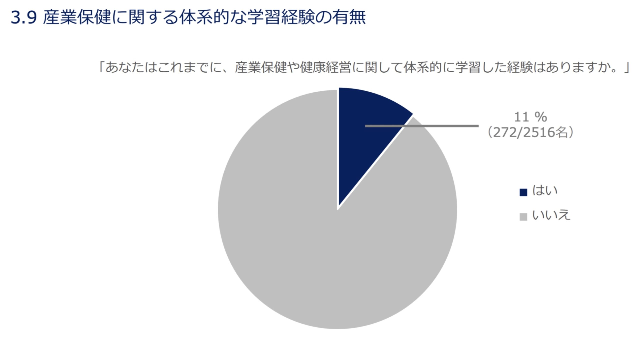 8)において、産業保健や健康経営に関して体系的に学習した経験があると回答した割合は、11%に留まります。産業保健領域でセラピストが貢献していくには、体系的な学習が必要となります。