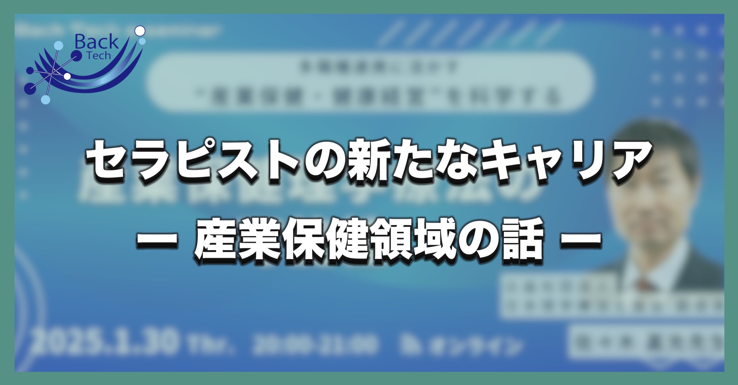 この度、バックテックeセミナーとして、産業保健・健康経営などの予防・保険外領域に興味があるセラピスト(PT・OT)が知っておきたい『産業保健・健康経営の科学』について、最新エビデンスや実例をもとに、日本最高峰の先生方から学ぶセミナーを全7回、なんと無料で開催中です。