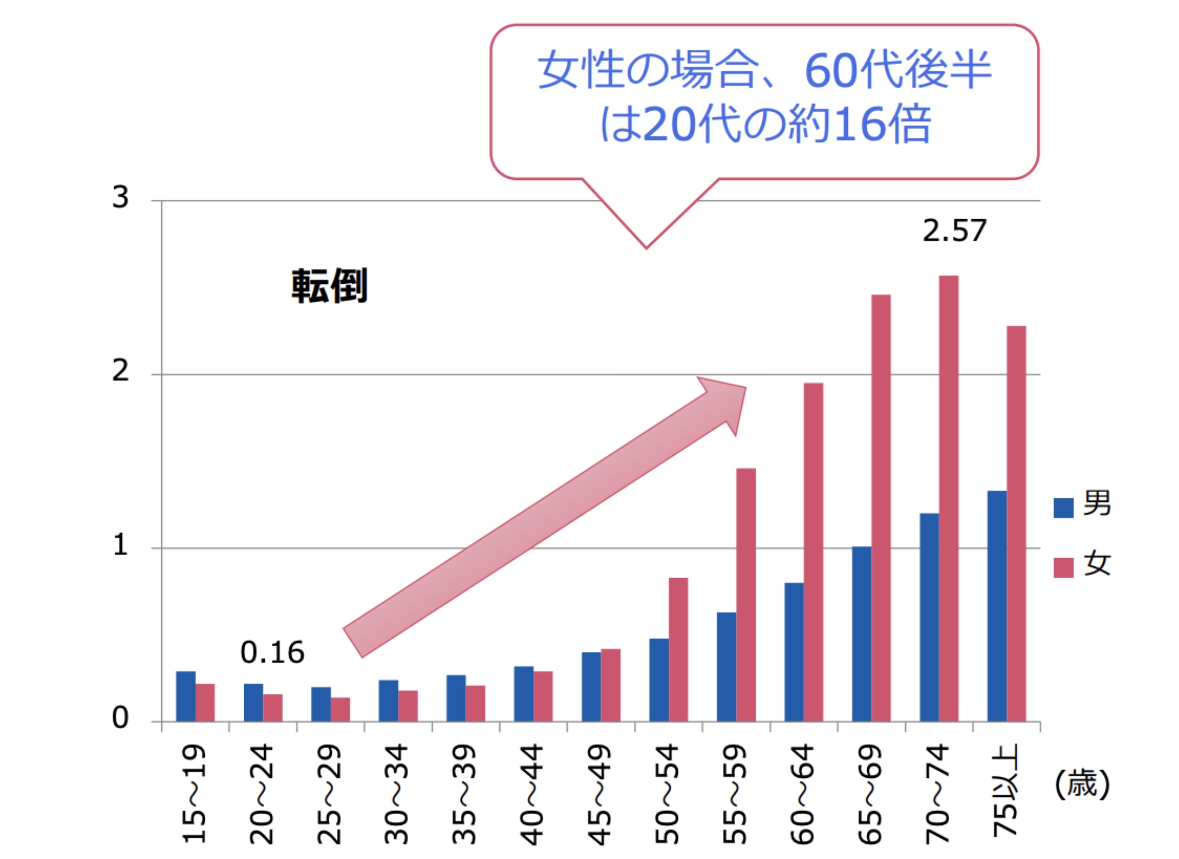 2)によると、第一位が「転倒」、第二位が腰痛の要因となる「動作の反動・無理な動作」であり、転倒に関しては高齢になるほど発生件数は上昇する傾向にあります