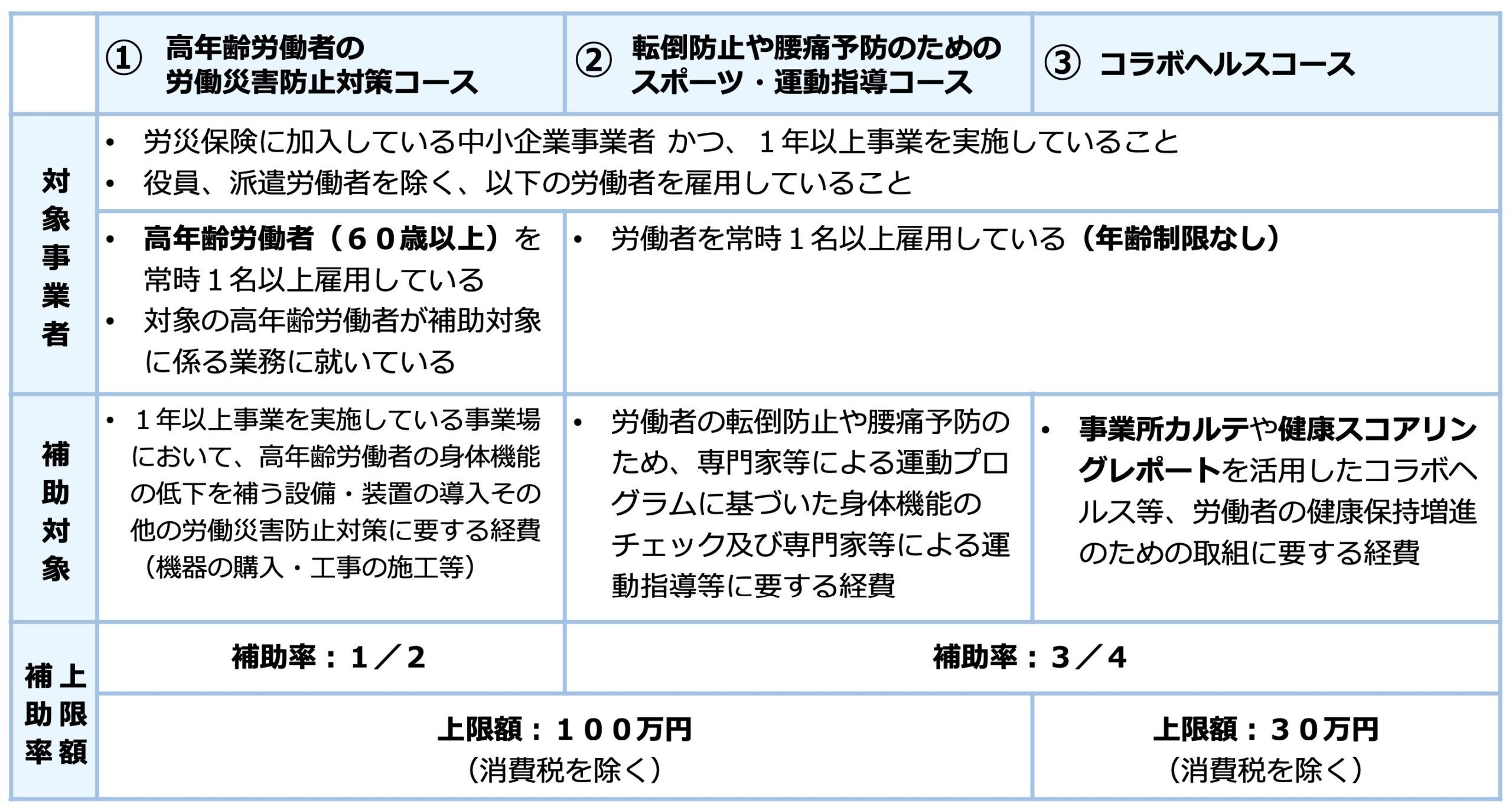 同補助金は、高年齢労働者の労働災害防止対策における機器の購入や環境整備のための工事から、発生件数の多い転倒や腰痛予防の為の身体機能チェックや運動指導などが対象となっています。添付の画像は、令和6年度の補助要件