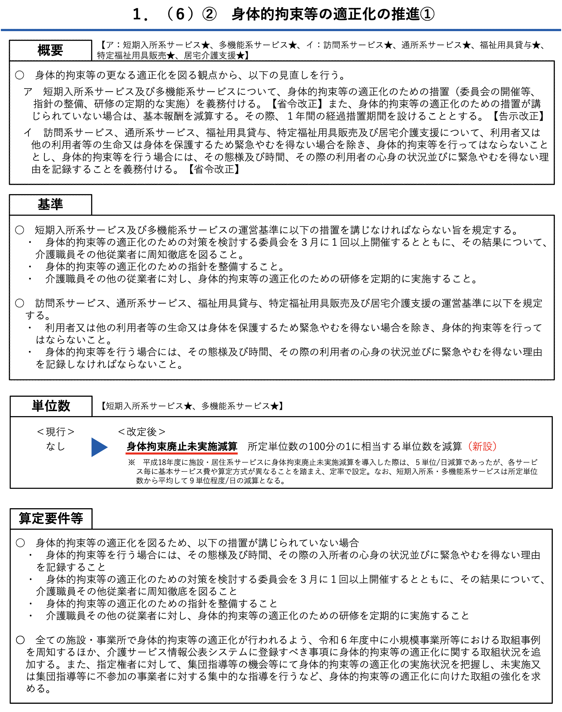これらの減算は、令和6年度介護報酬改定において、利用者の人権擁護や虐待防止を推進するとともに、身体的拘束の適正化を図る観点から導入されたもの。適切な措置が講じられていない場合に「基本報酬を減算」する措置となっている。