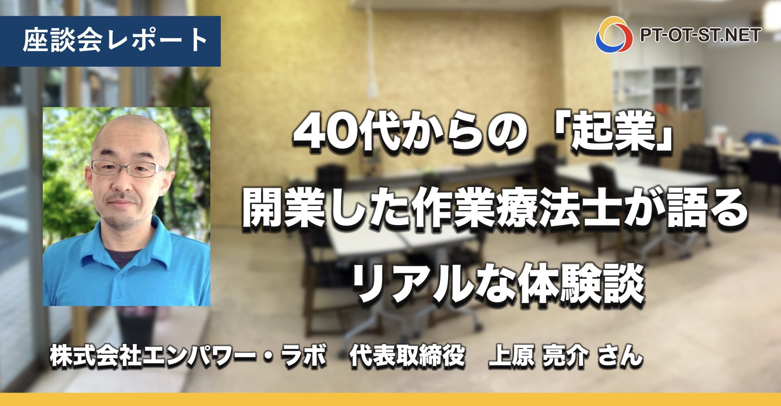 先日、就労支援施設を立ち上げた作業療法士の上原亮介さんをゲストにお迎えし、『40代からの「起業」という選択肢』をテーマにPT-OT-ST.NET主催で座談会を開催しました。