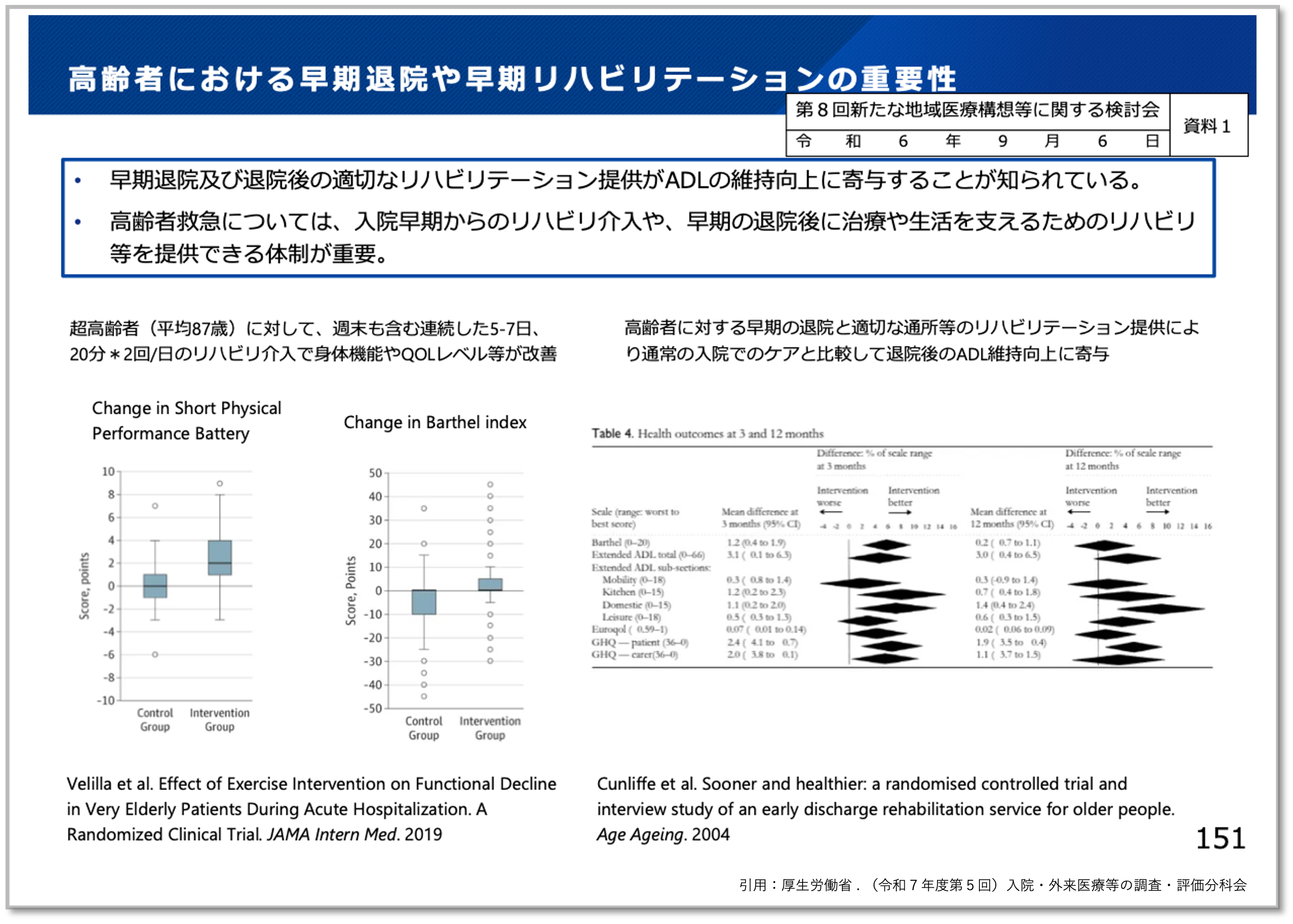 厚生労働省は、早期退院及び退院後の適切なリハビリテーション提供がADLの維持向上に寄与することについて科学的根拠を用いて説明した。