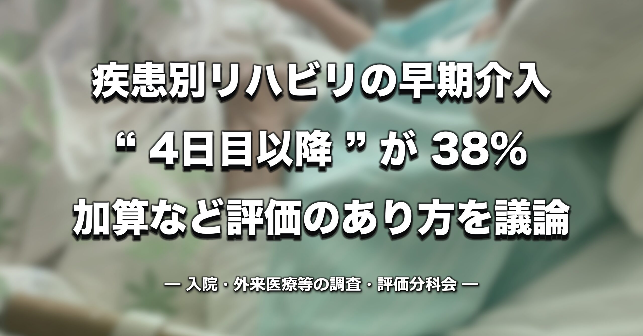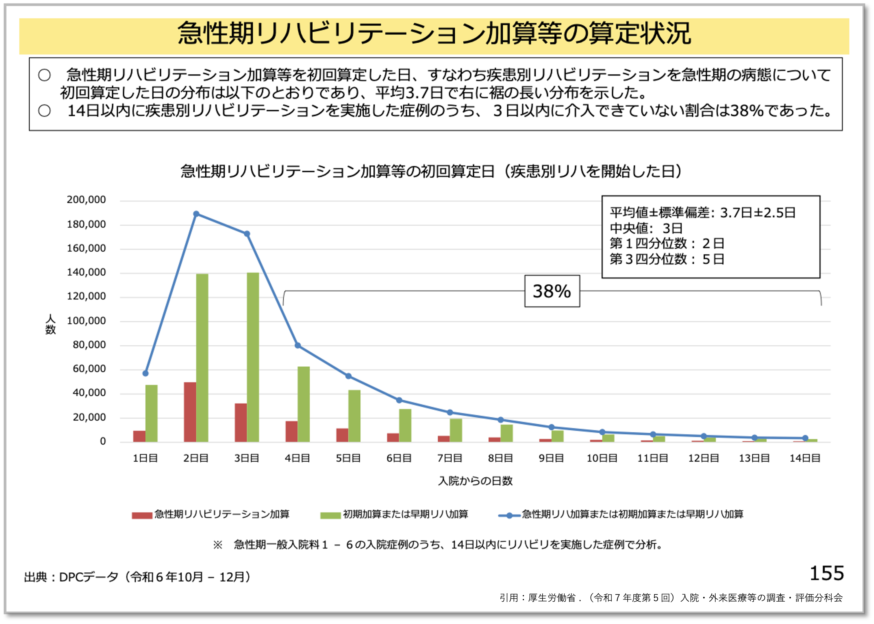 実際、DPCデータを用いた分析によると「14日以内に疾患別リハビリを実施した症例のうち、38%が3日以内に介入できていない」という現場の実態があることを、厚生労働省は報告した。