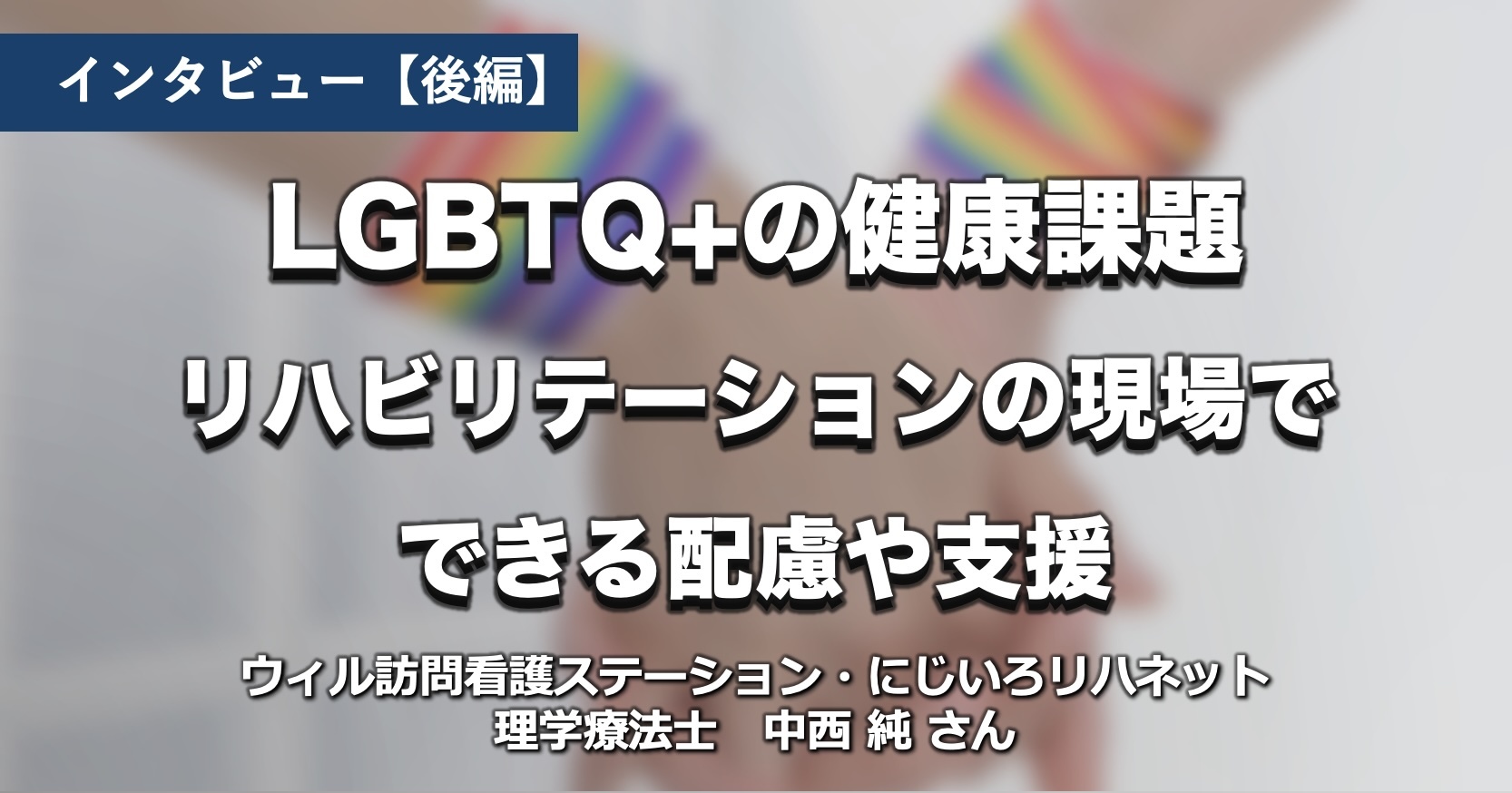 後編では、「LGBTQ+に多い健康課題」や「リハビリテーションの現場でできる配慮や支援」について、理学療法士・中西さんにお話いただきました。
