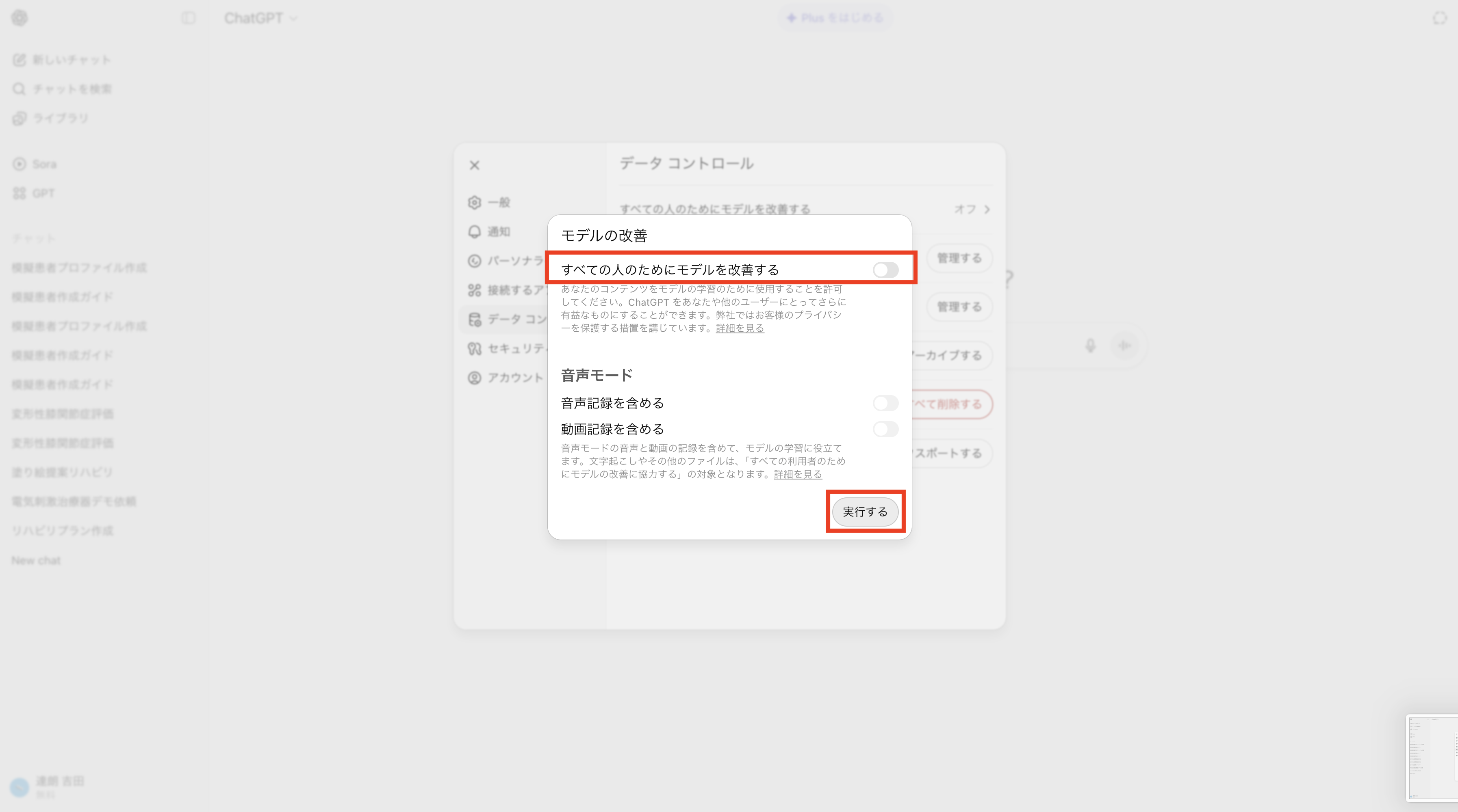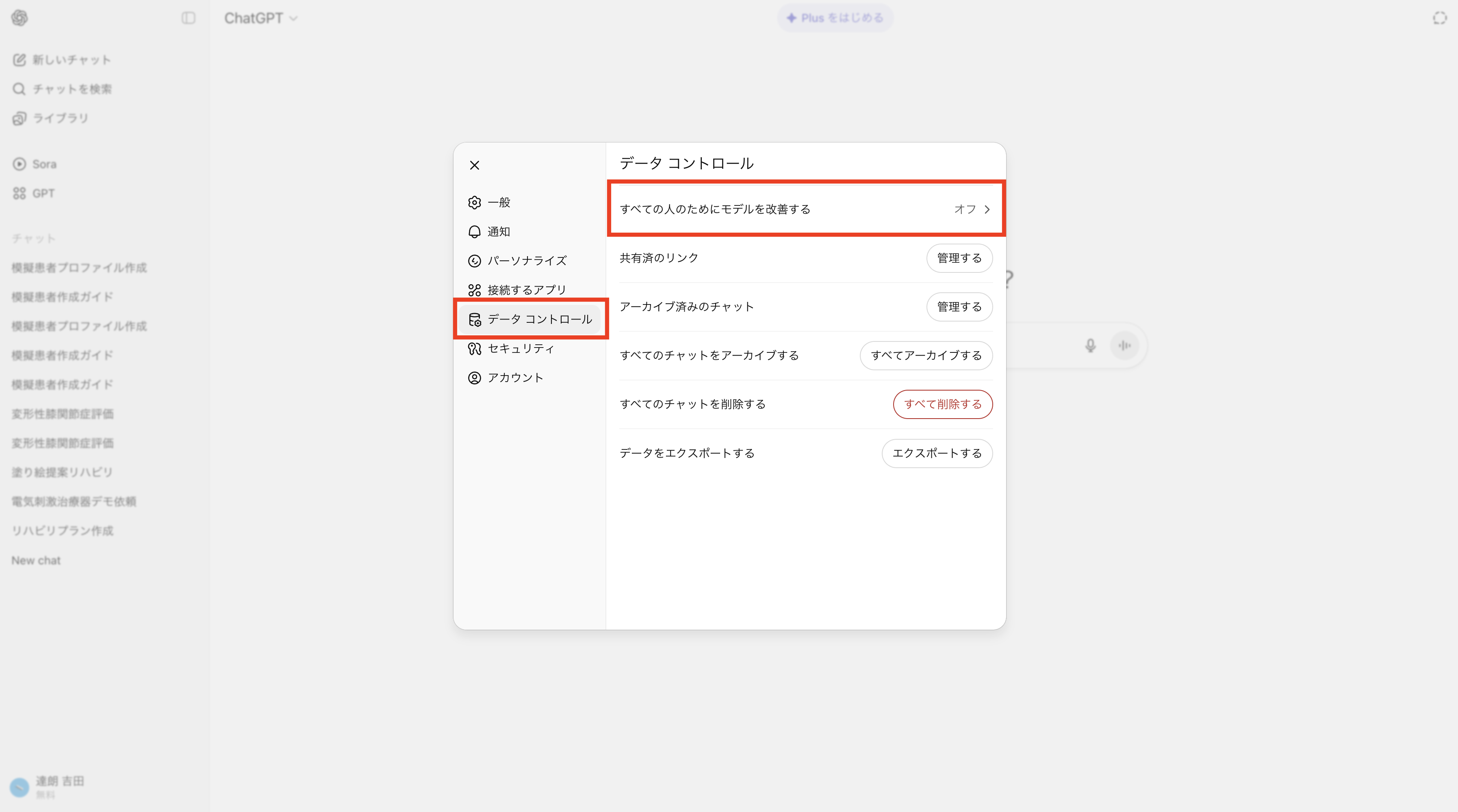 ■ChatGPTにデータを学習させないための設定患者などの個人情報が誤って指示文に入っていた場合に、ChatGPT側に学習させない事前の設定があります。ご利用の際は、ぜひご確認ください。