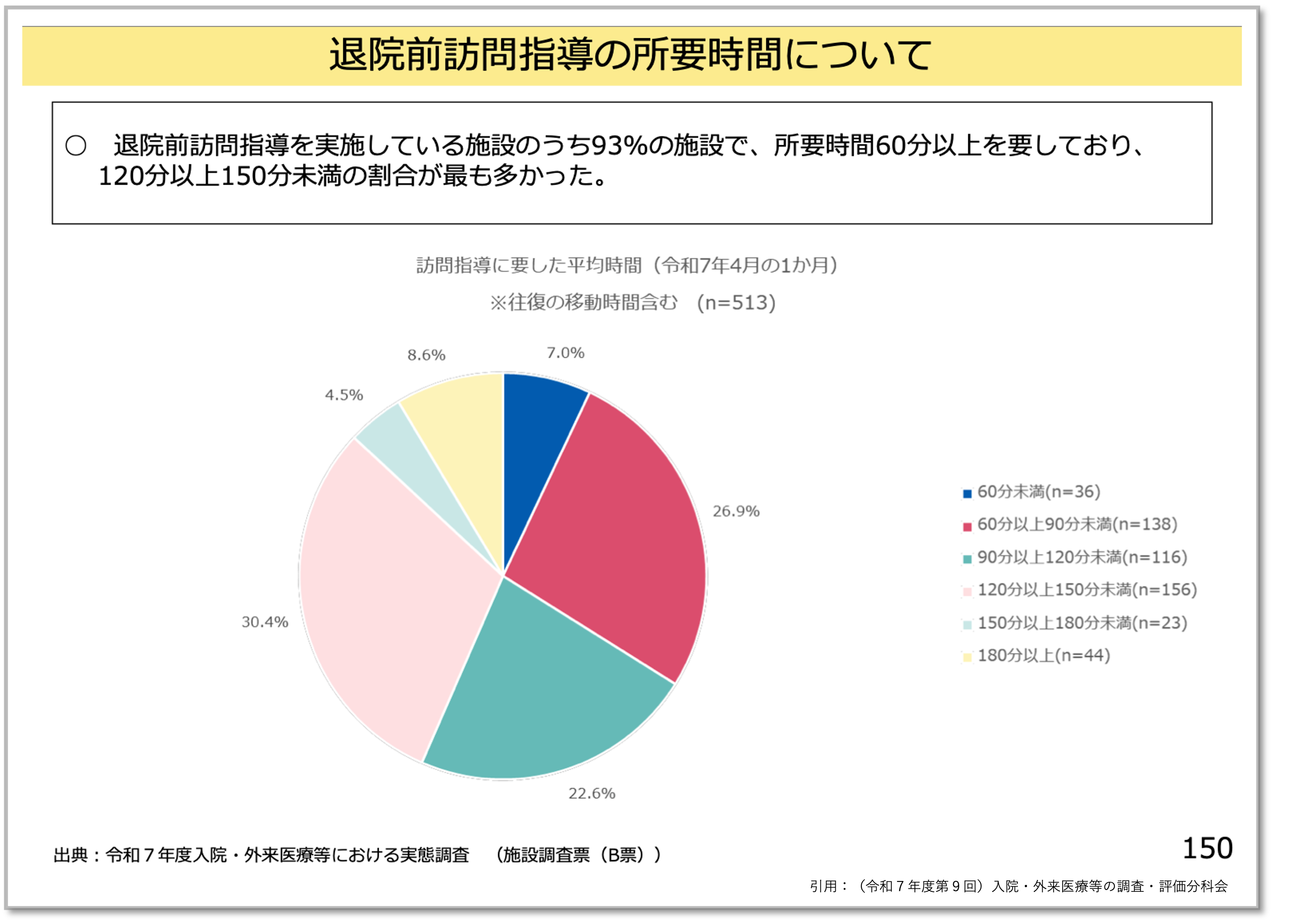 厚生労働省が行なった実態調査によると、退院前訪問指導の実施施設のうち93%が「60分以上」を要しており、その中でも「120分以上150分未満」が最も多い割合を占めていた。