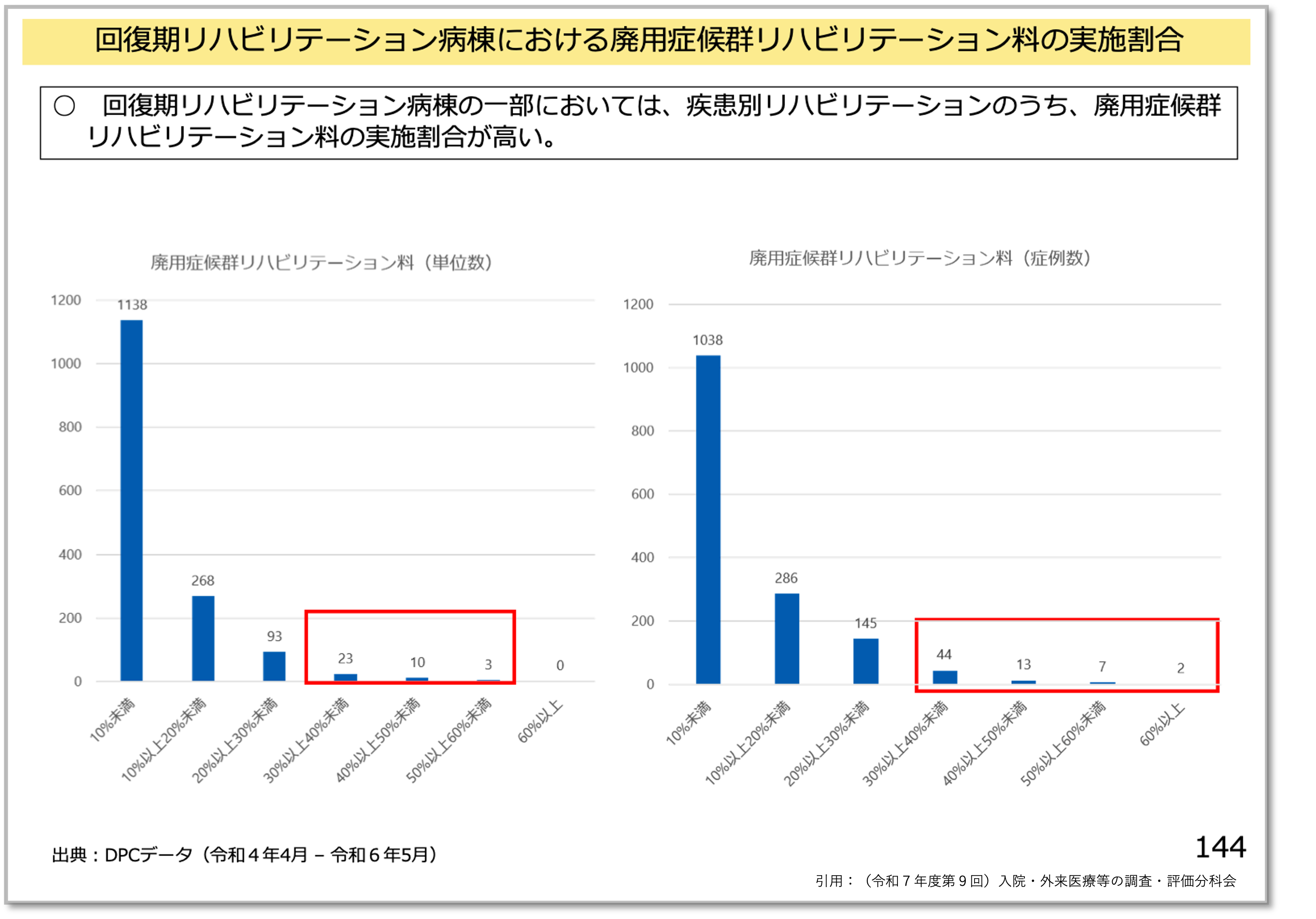 一方で、一部の病棟では全患者のうち 40%以上が廃用症候群リハビリテーション料を実施している現状もあり、相対的に高い割合で実施されている例もあることがDPCデータより明らかとなった。