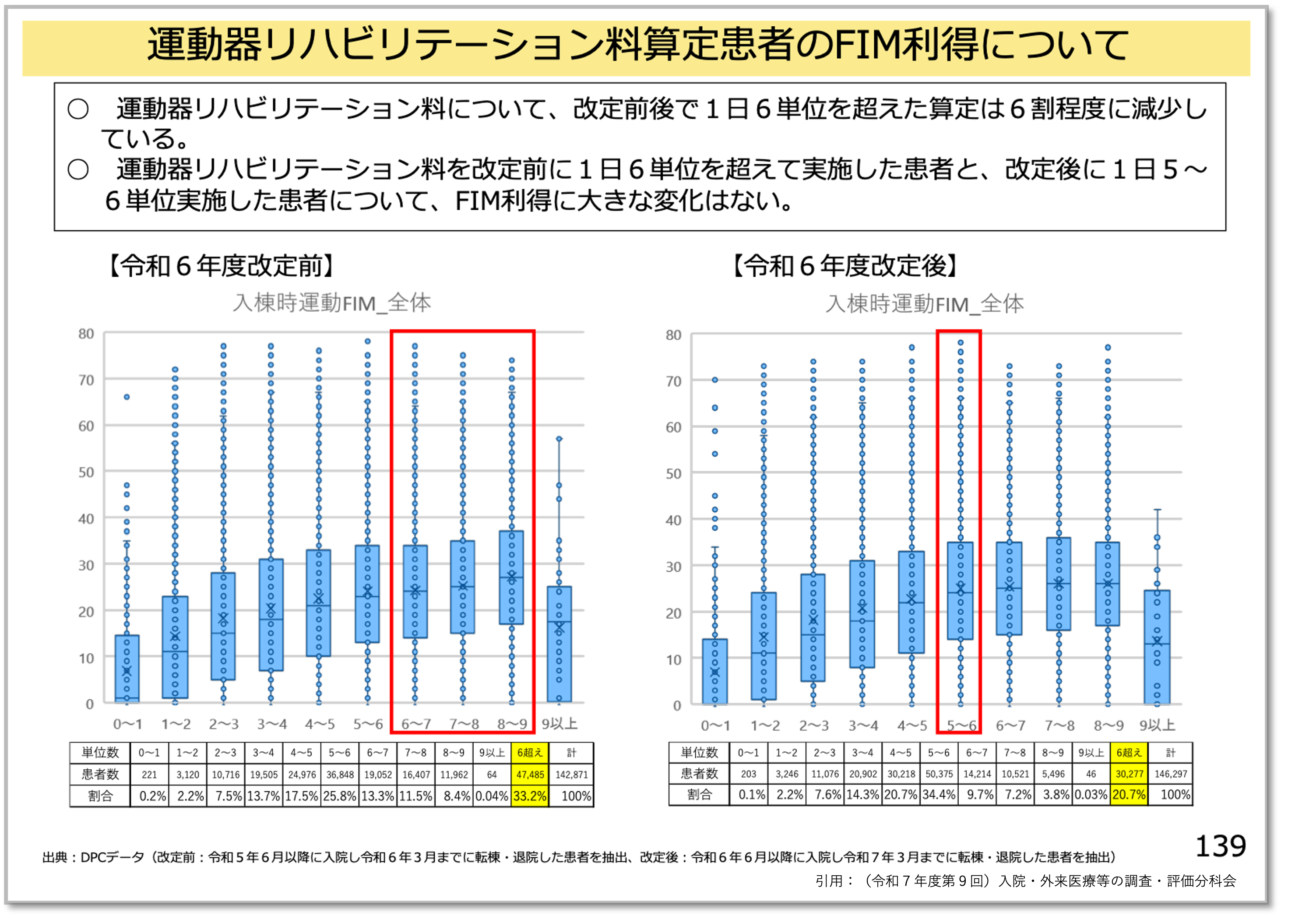 今回(第9回)の分科会では、令和6年度診療報酬改定で行われた「運動器リハビリテーション料の算定単位数の見直し」について、その後のFIM利得の変化について厚生労働省は言及した。