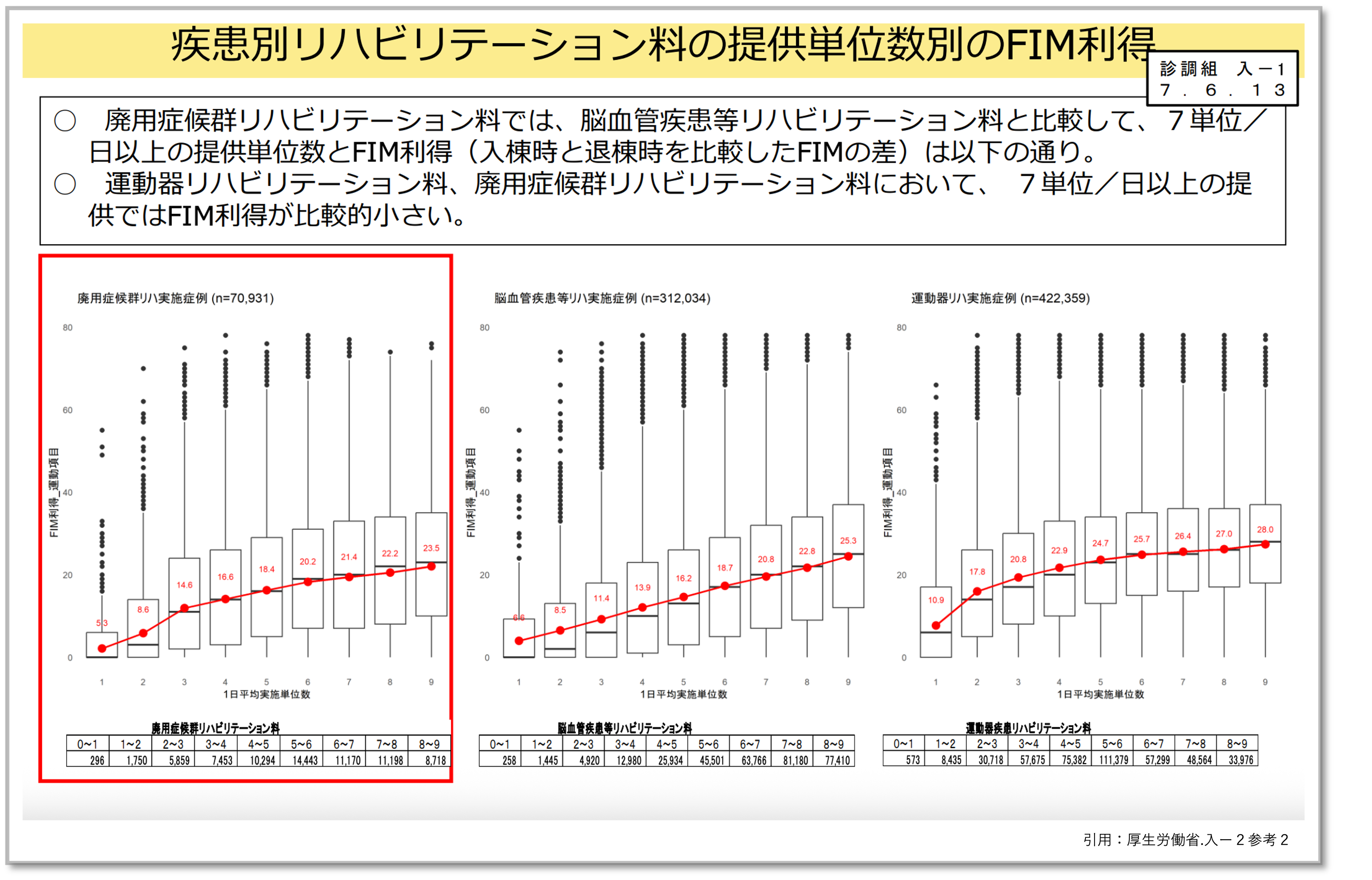 廃用症候群リハビリテーション料では、1日7単位以上のリハビリテーション提供でもFIM利得が比較的小さいという分析結果が示されるなど、診療報酬上の評価のあり方について課題が示された。