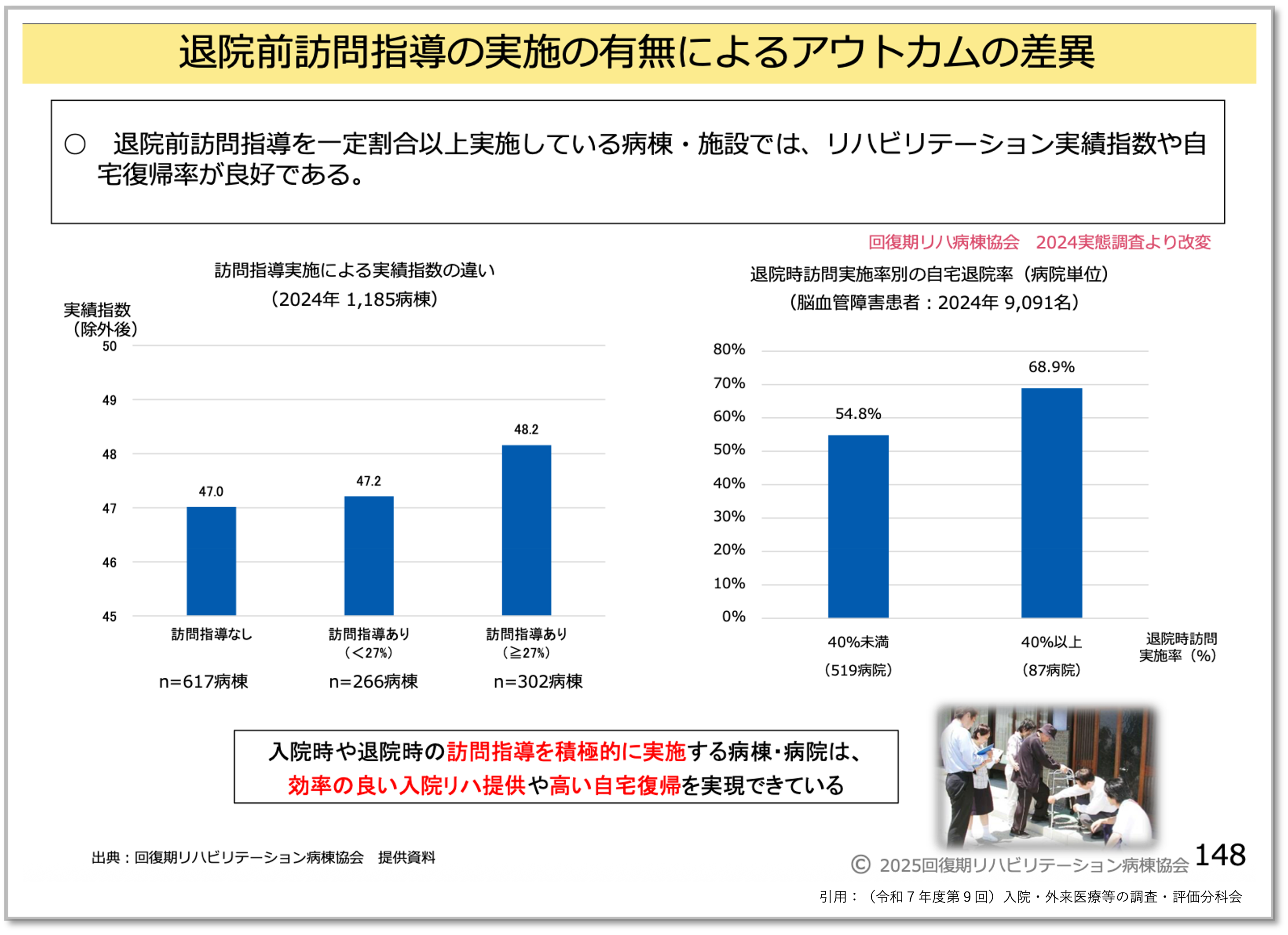 今回の分科会では、退院前訪問指導を一定割合以上実施している病棟・施設ではリハビリテーション実績指数や自宅復帰率が良好であることを資料にて提示し、事例を通じてその効果について報告した。