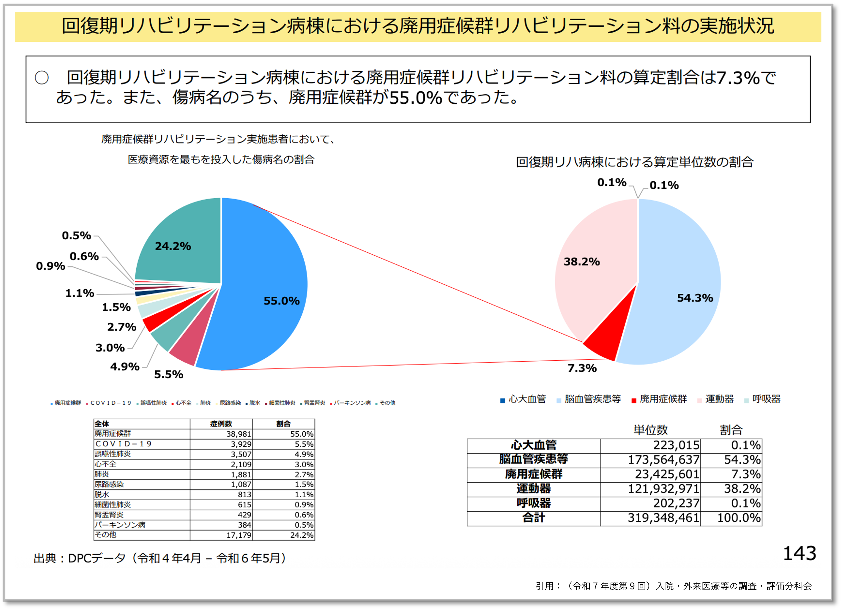 また、廃用症候群リハビリテーションを実施している施設が多数あることを踏まえ、疾患別リハビリテーション料の算定上限単位数のあり方についても検討する必要があるとの意見が示されていた。