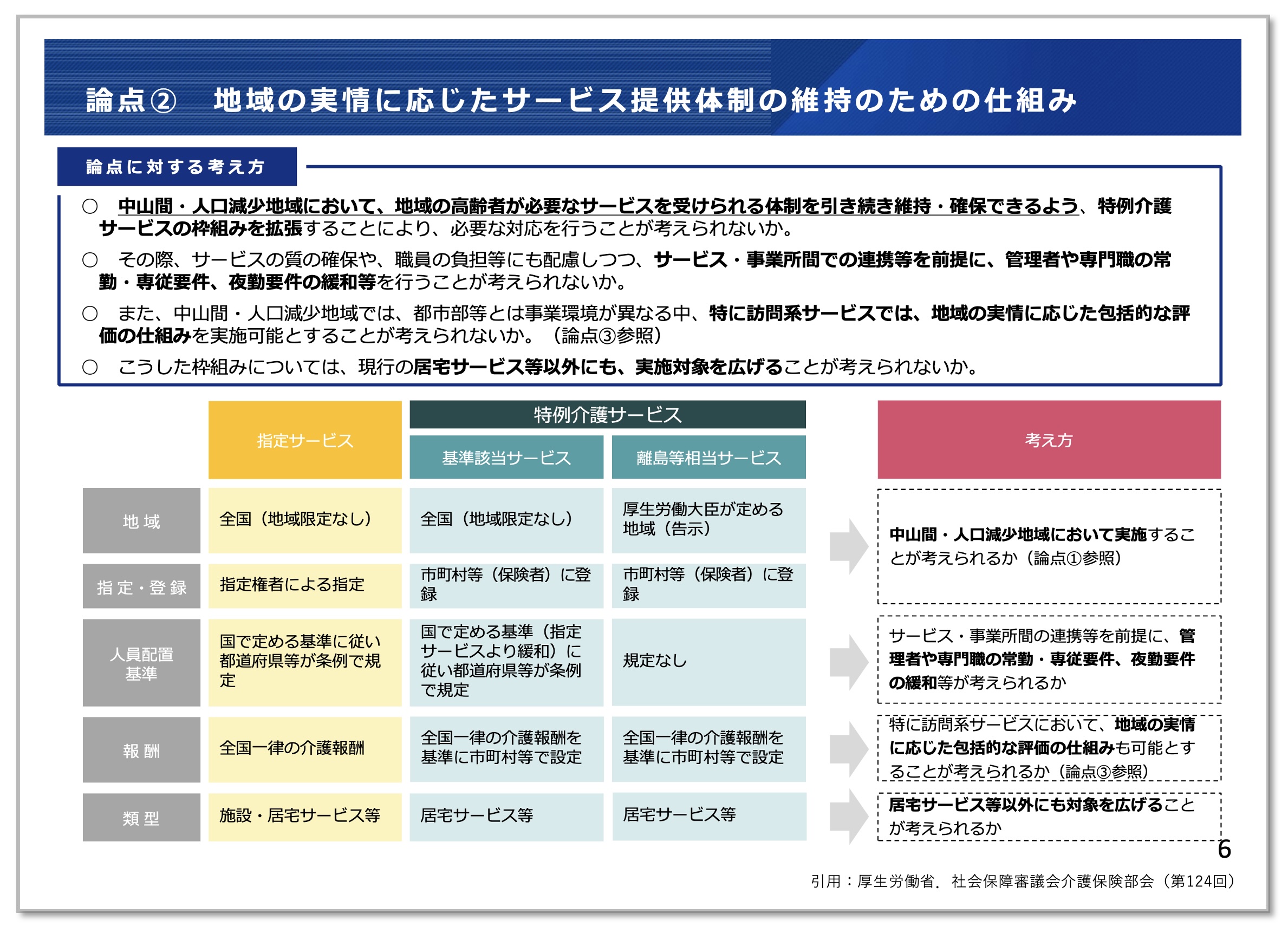 そのほか今回の部会では、中山間・人口減少地域における介護サービスの維持のため、専門職の常勤・専従要件や夜勤要件などの人員配置基準の緩和や、市町村が介護保険財源を活用し、事業者へ委託してサービスを実施する新たな枠組みの導入についても提案されました。