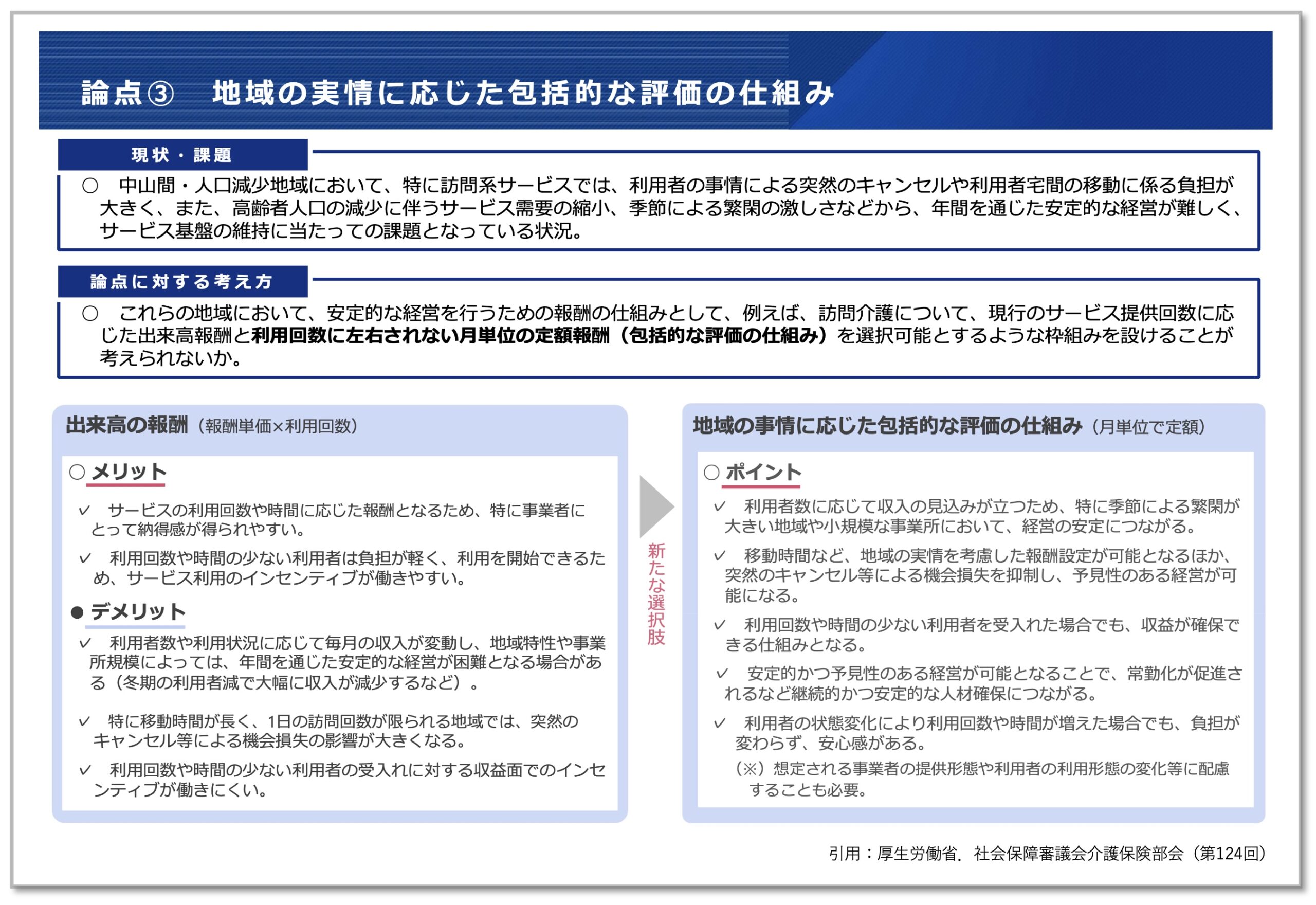 9月8日に開催された「介護保険部会」(第124回)では、中山間・人口減少地域における介護サービスの維持に関して、特に訪問系サービスへの「包括報酬」の導入が提案され、議論が行われました。