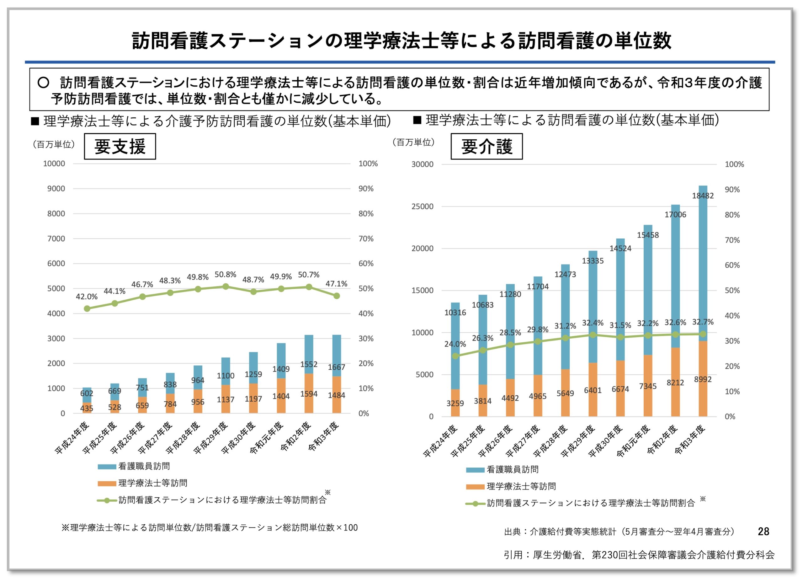 しかし、訪問看護ステーションにおける全体の単位数のうち、理学療法士等による訪問は要支援の方に対するサービスで約半分(令和3年度で47.1%)、要介護の方に対するサービスで約3分の1を占めています(令和3年度で32.7%)。