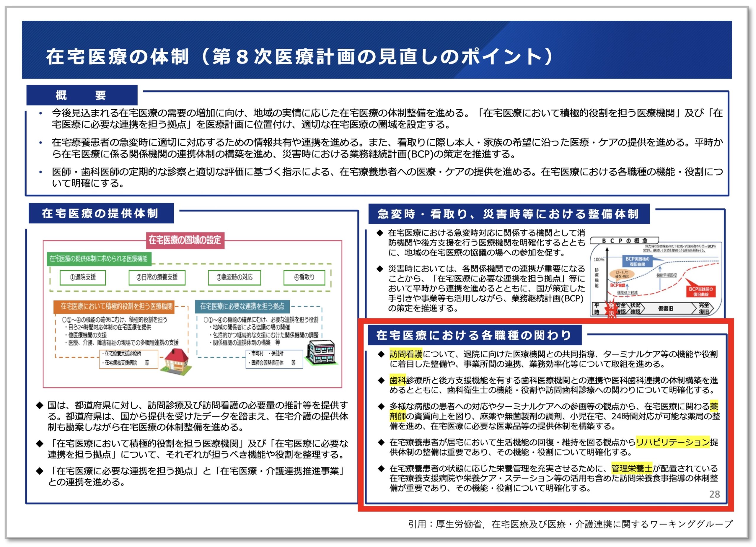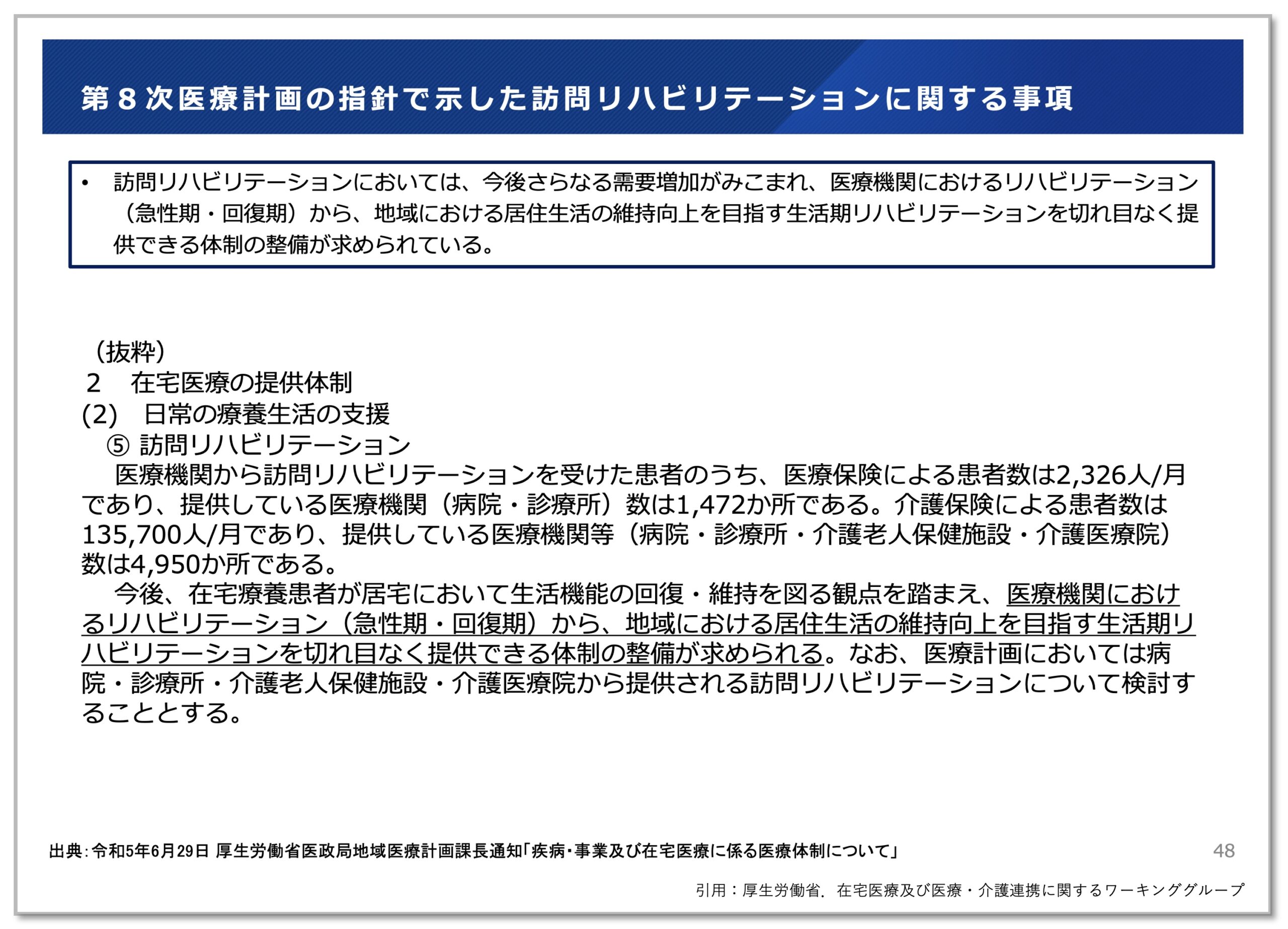 在宅医療の体制については、第8次医療計画の見直しのポイントとして「在宅療養患者が居宅において生活機能の回復・維持を図る観点からリハビリテーション提供体制の整備は重要であり、その機能・役割について明確化する」ことが明記されました。