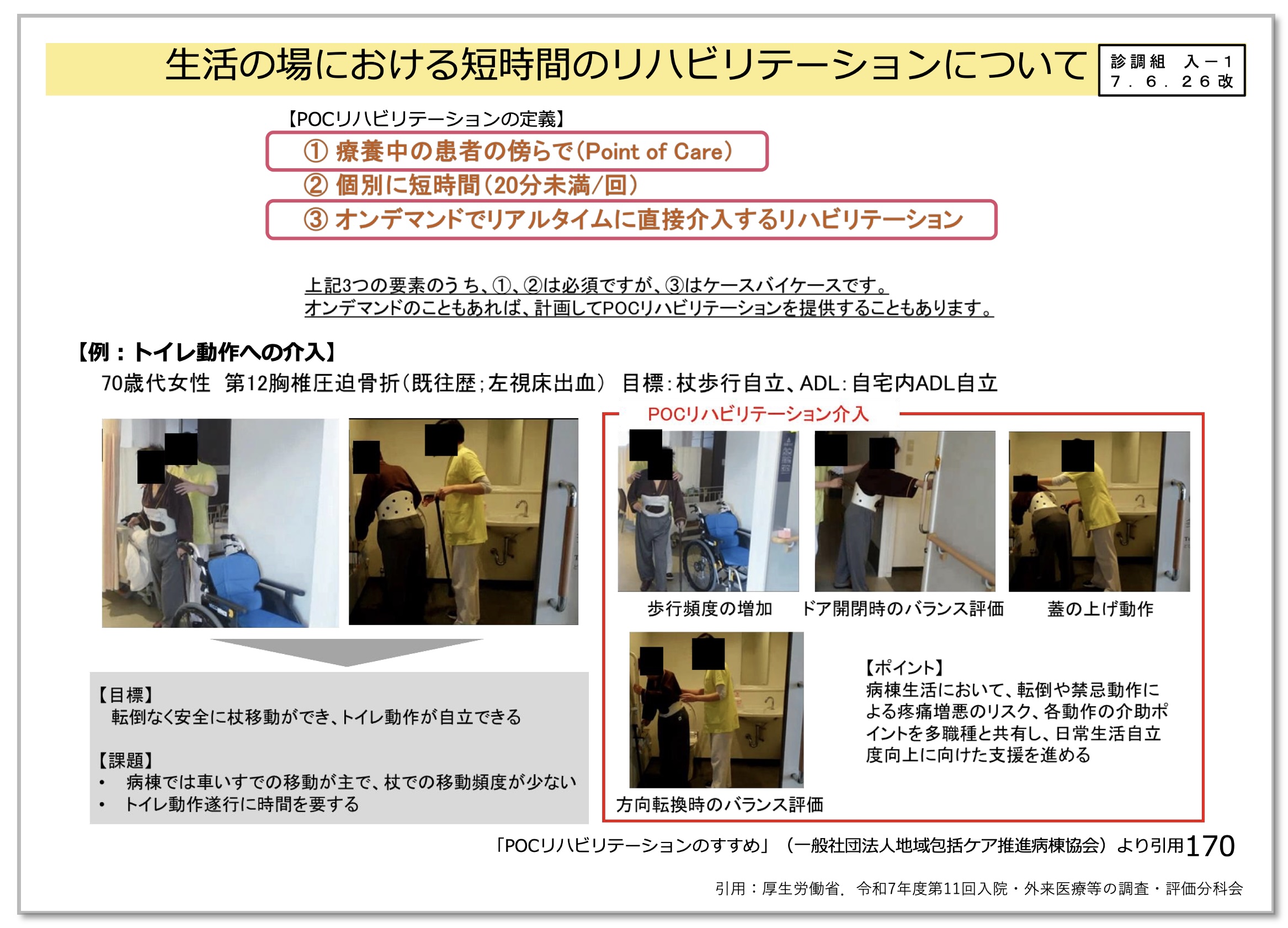 さらに、病棟でのADL維持・向上を目的とした介入が「生活介助の延長」とみなされることなく、リハビリとして正しく位置付けられるよう、今後は科学的な検証を進める方針となっています。