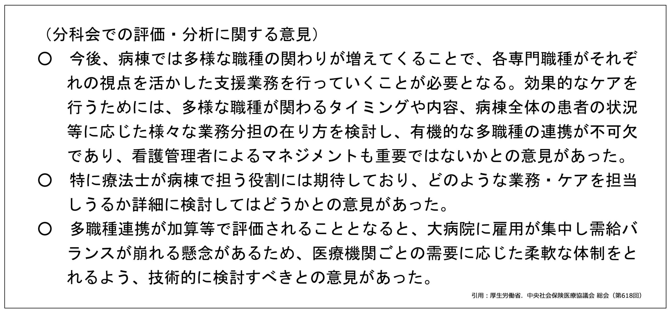 また分科会では、病棟での多職種連携による日常生活動作(ADL)の維持・向上は、今後の医療提供体制を支える上で重要性が高まっていること等が議論されてきました。