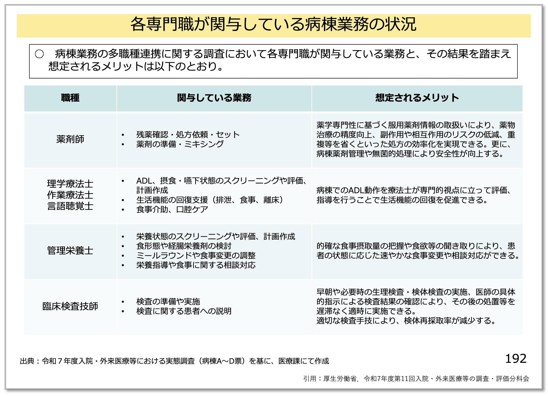 こうした背景を踏まえ、報告書の「病棟における看護業務とタスクシェア」に関する議論では、「療法士が病棟でどのような業務やケアを担いうるのか、より詳細に検討すべき」との意見が出され、今後の制度設計に向けた重要な視点として位置づけられました。