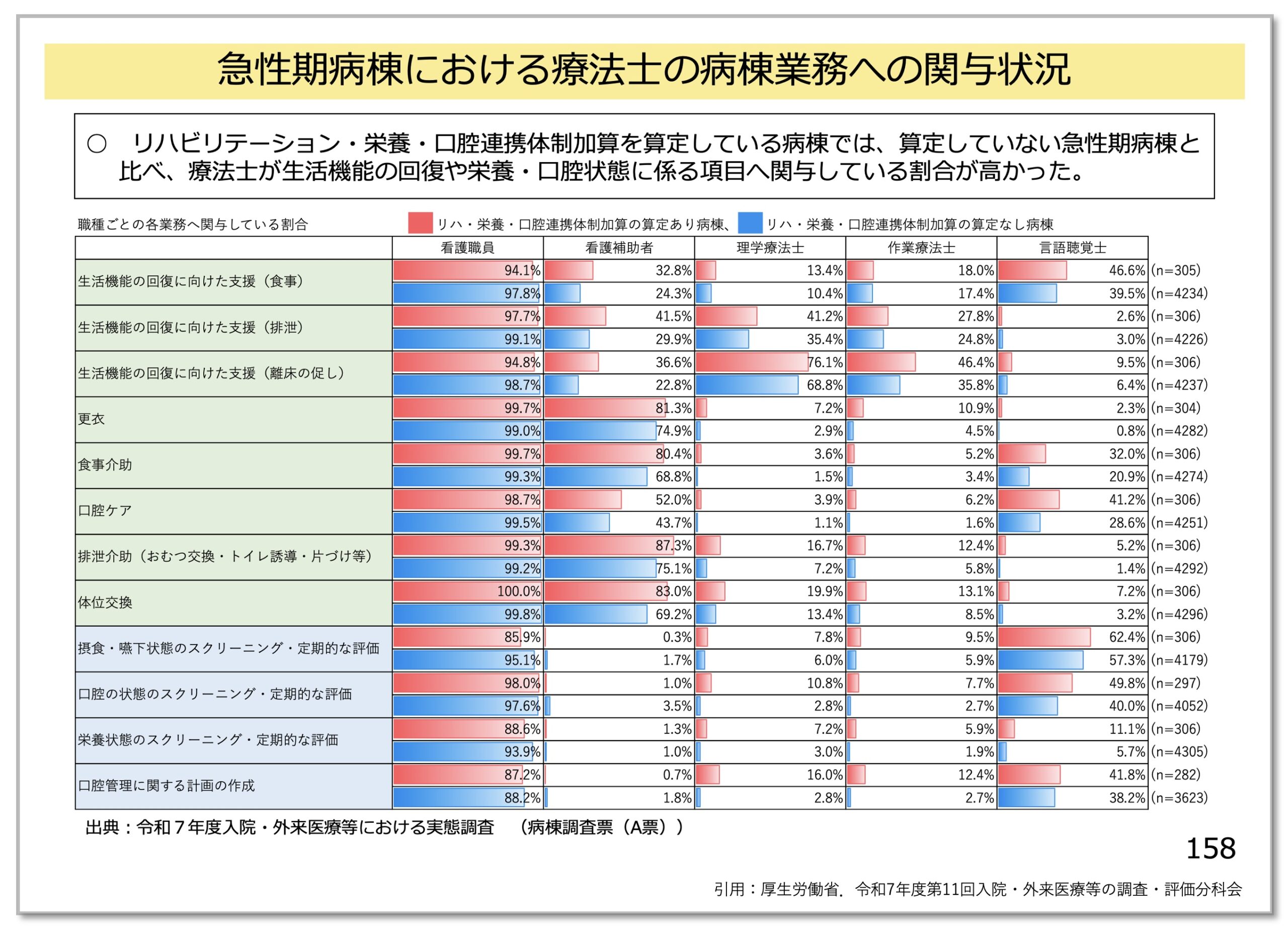 調査結果によると、同体制加算を算定している急性期病棟では「食事支援」「離床の促し」「嚥下状態の評価」といった生活機能の回復に直結する支援への療法士の関与が、非算定病棟に比べて高い割合で行われていました。