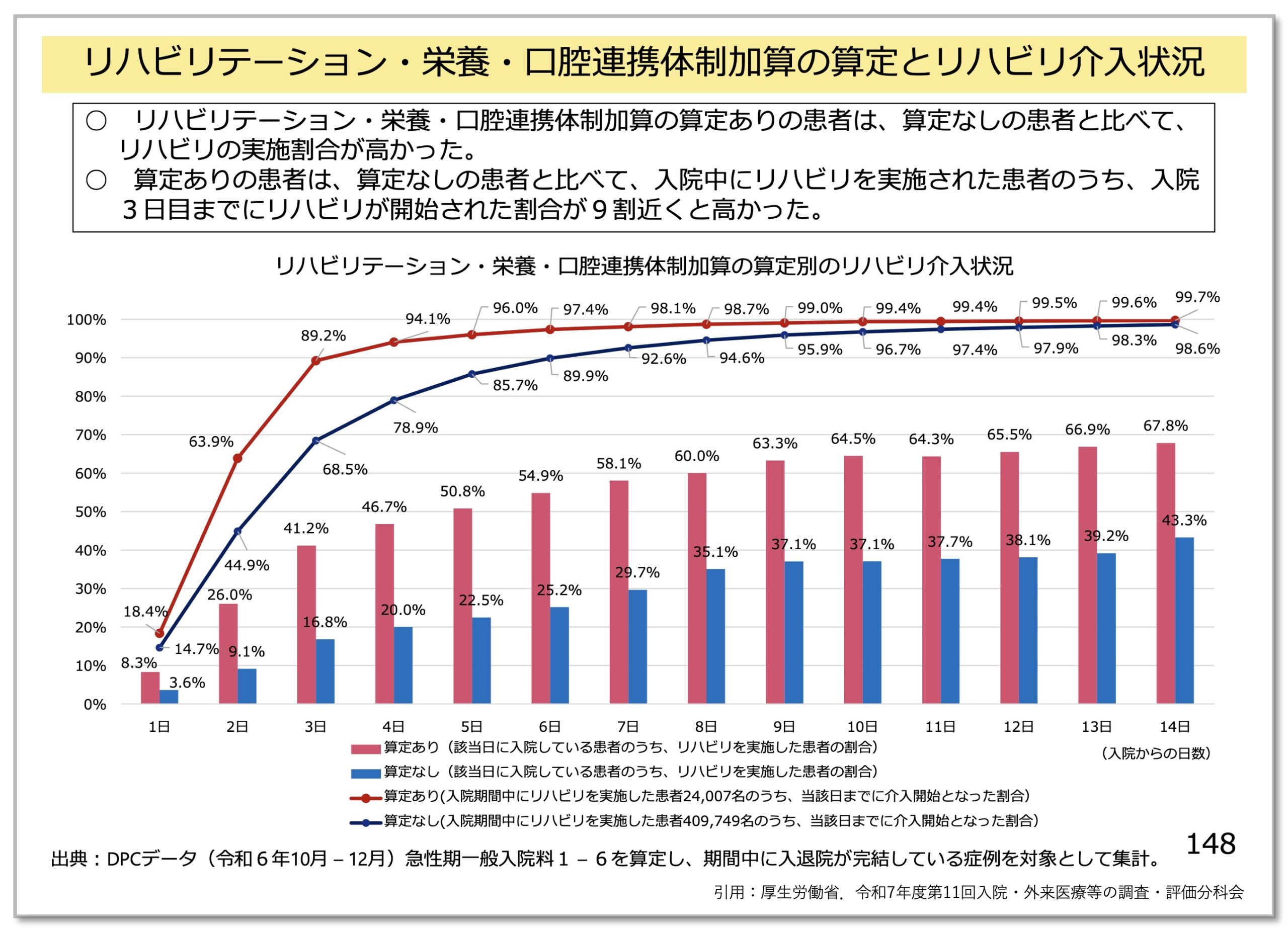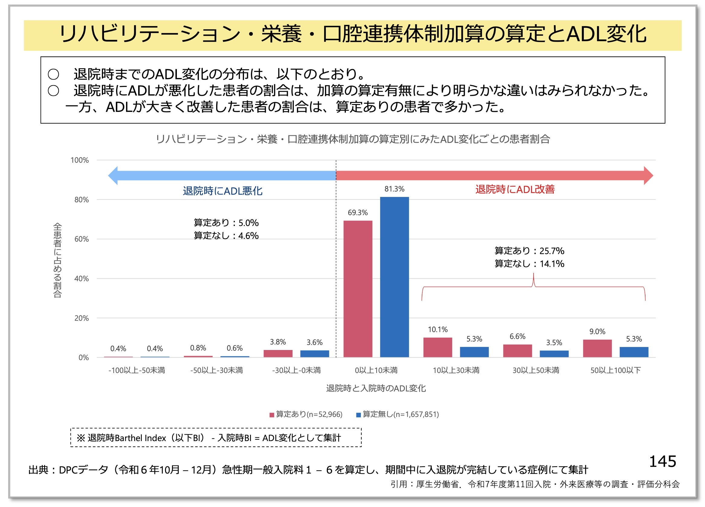 「リハビリテーション・栄養・口腔連携体制加算」の算定群には要介護度が高く、ADL低下リスクを抱える高齢患者が多いにもかかわらず改善が確認されており、多職種による早期・集中的な介入の有効性を裏付けるデータといえます。
