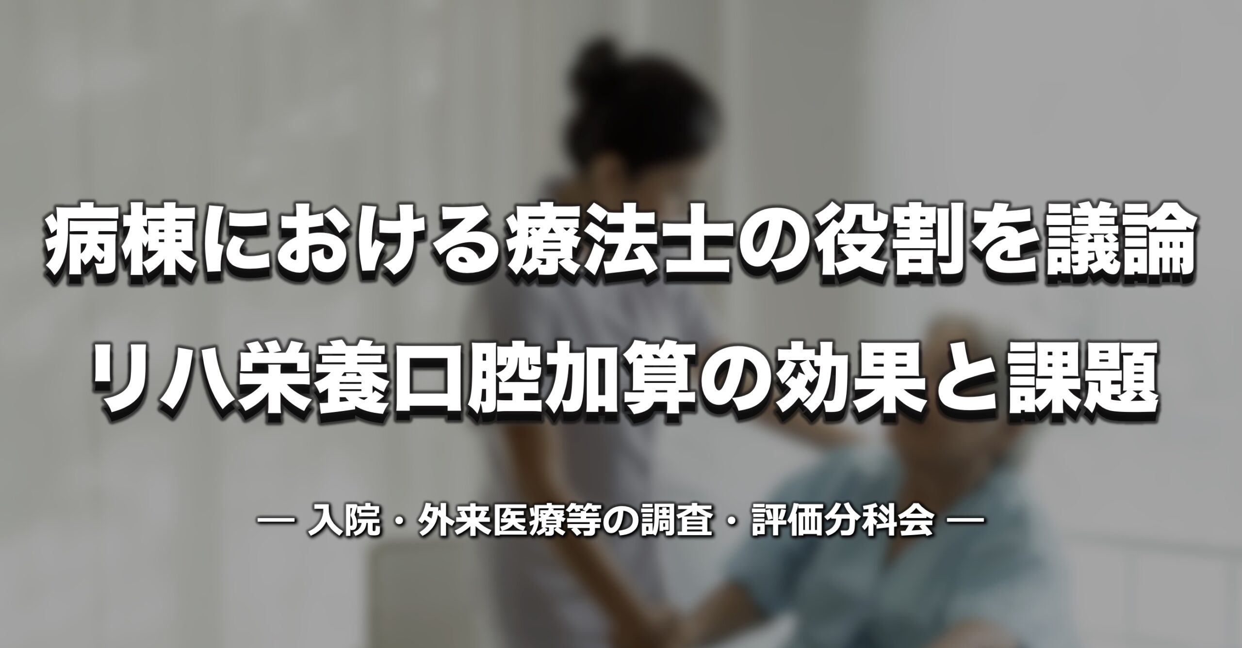 これまで入院・外来医療等の調査・評価分科会では、「リハビリテーション・栄養・口腔連携体制加算」(以下、体制加算)や、新設された「地域包括医療病棟」における療法士の配置、業務実態、アウトカムに関する詳細な分析結果が示され、活発な議論が展開されました。