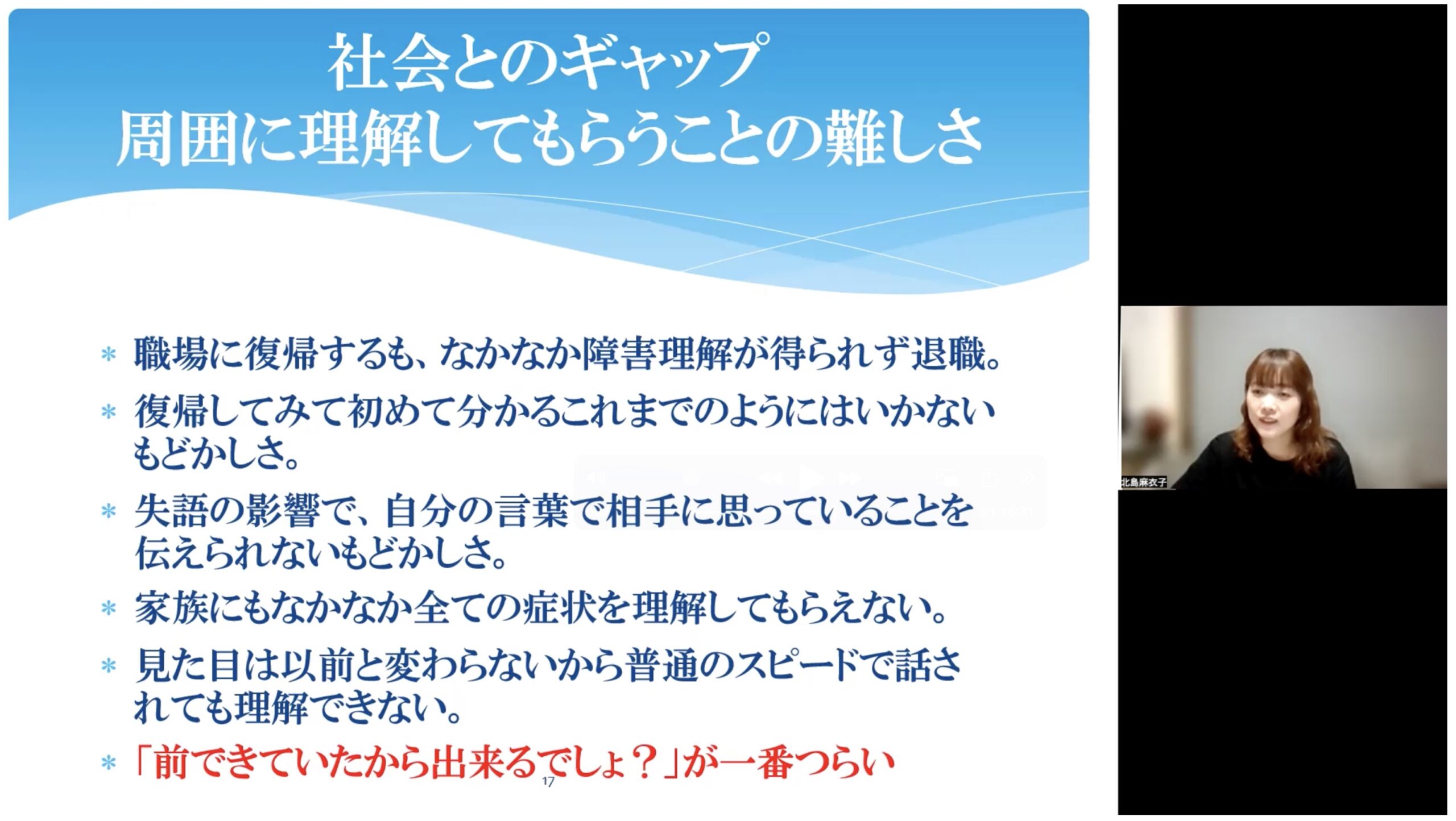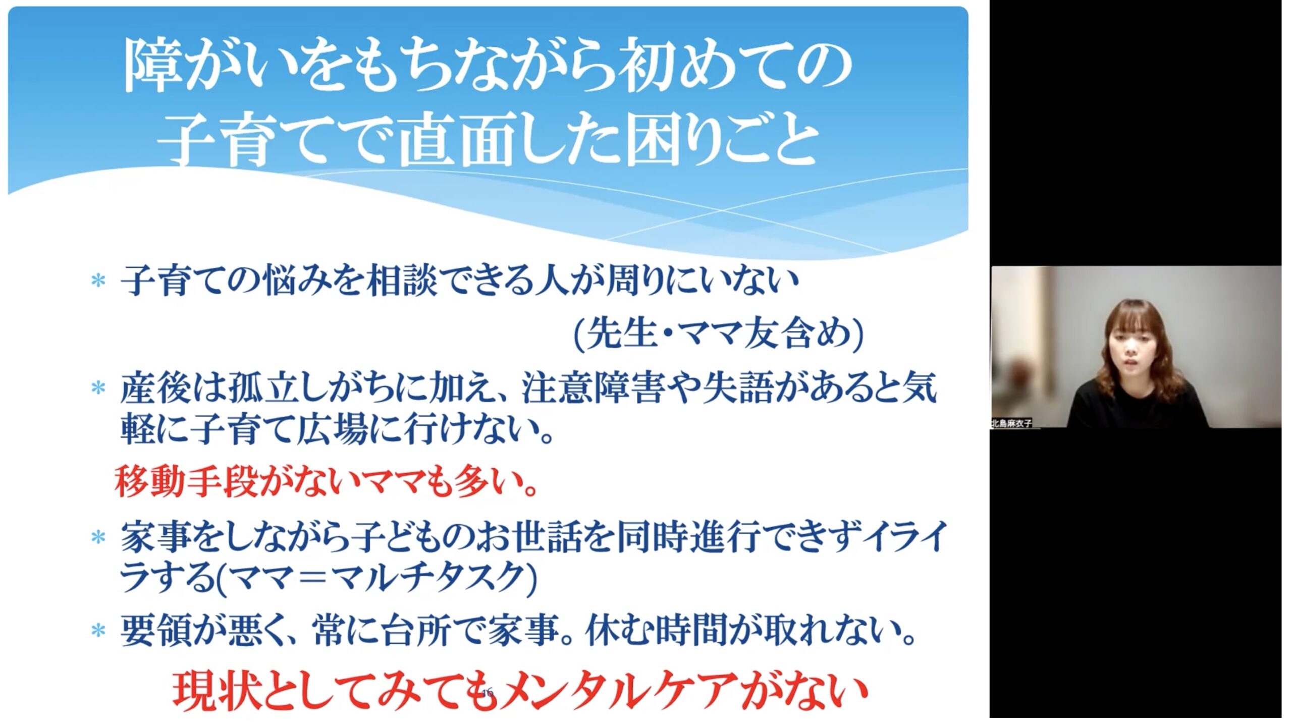 北島さんは妊娠中に脳出血を発症し、高次脳機能障がいの後遺症を抱えながら育児と生活を続けてこられました。退院後は、入院中には想像できなかったさまざまな課題に直面し、当たり前にできていたことができない戸惑いや、見た目ではわかりにくい障害ゆえの周囲の理解の難しさについて語られました。
