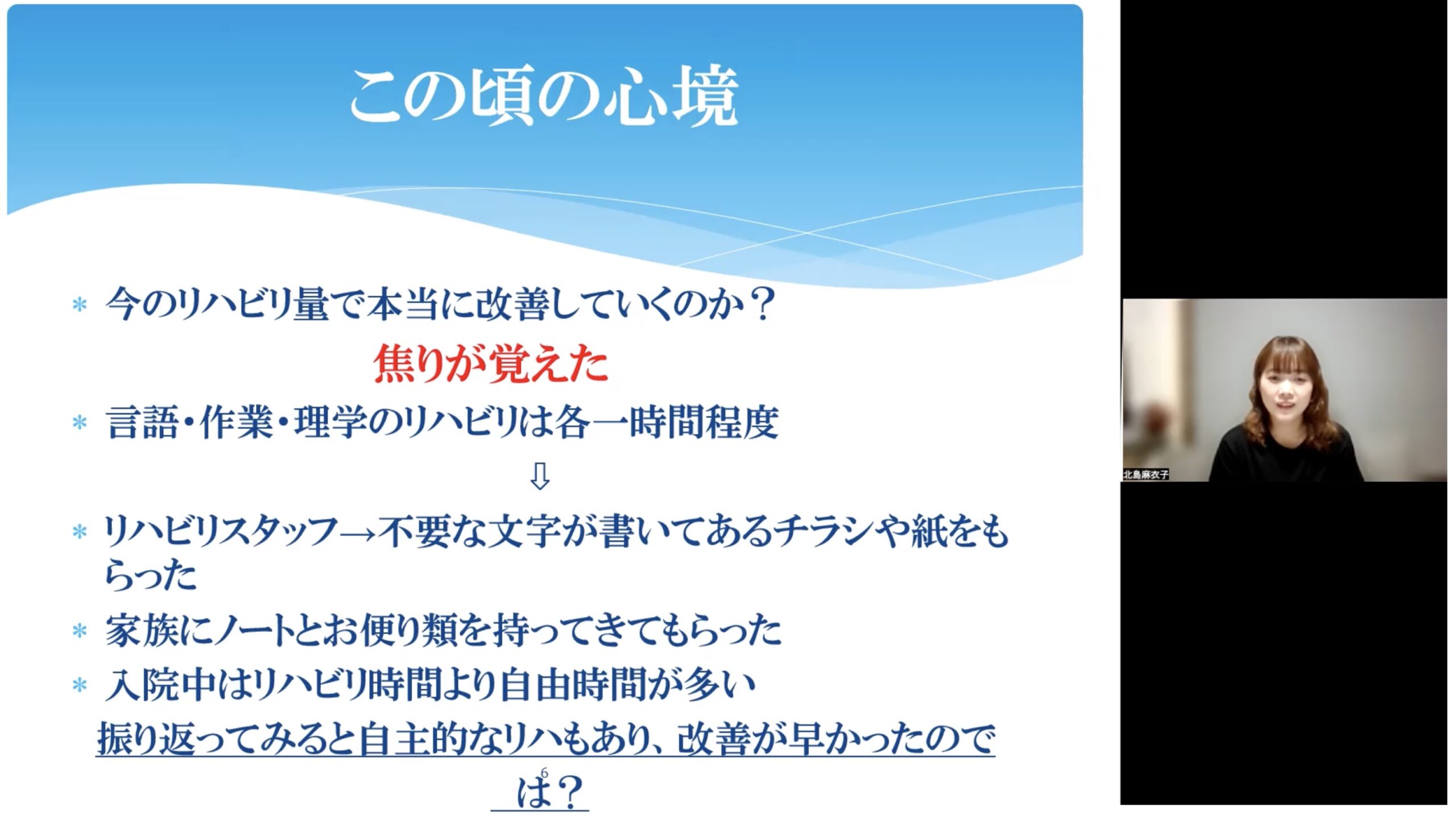 当日の北島さんの言葉一つひとつは、文字では表現しきれない、当事者としての生の声や感情の込もった表現もあり、臨床現場で働く方にとって多くの気づきが得られる内容となっています。特に、退院後に直面する課題や、リハビリテーション専門職に求められる関わり方についての具体的なお話は、臨床現場で働く方にとって多くの気づきを得られる内容となっています。