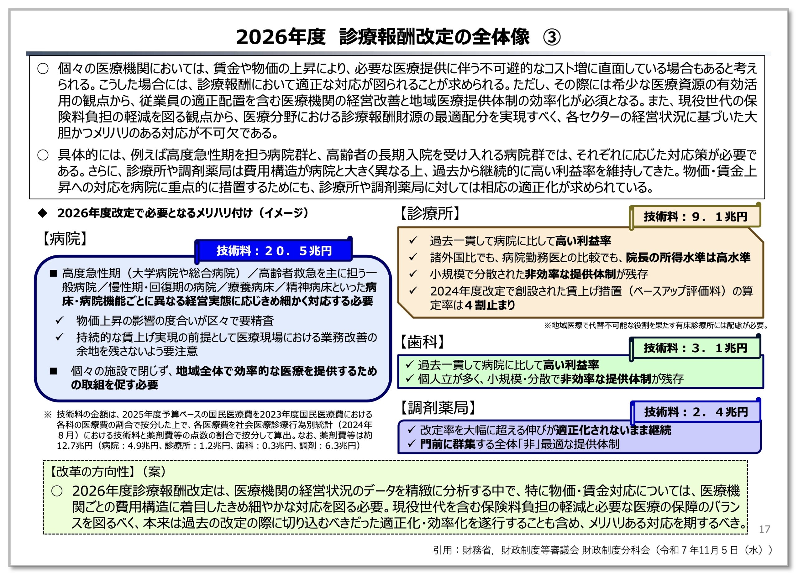 財務省は、2026年度(令和8年度)診療報酬改定の全体像における「改革の方向性(案)」として、現役世代の保険料負担の抑制と、効率的で持続可能な医療・介護産業構造への転換を目指す姿勢を示しました。