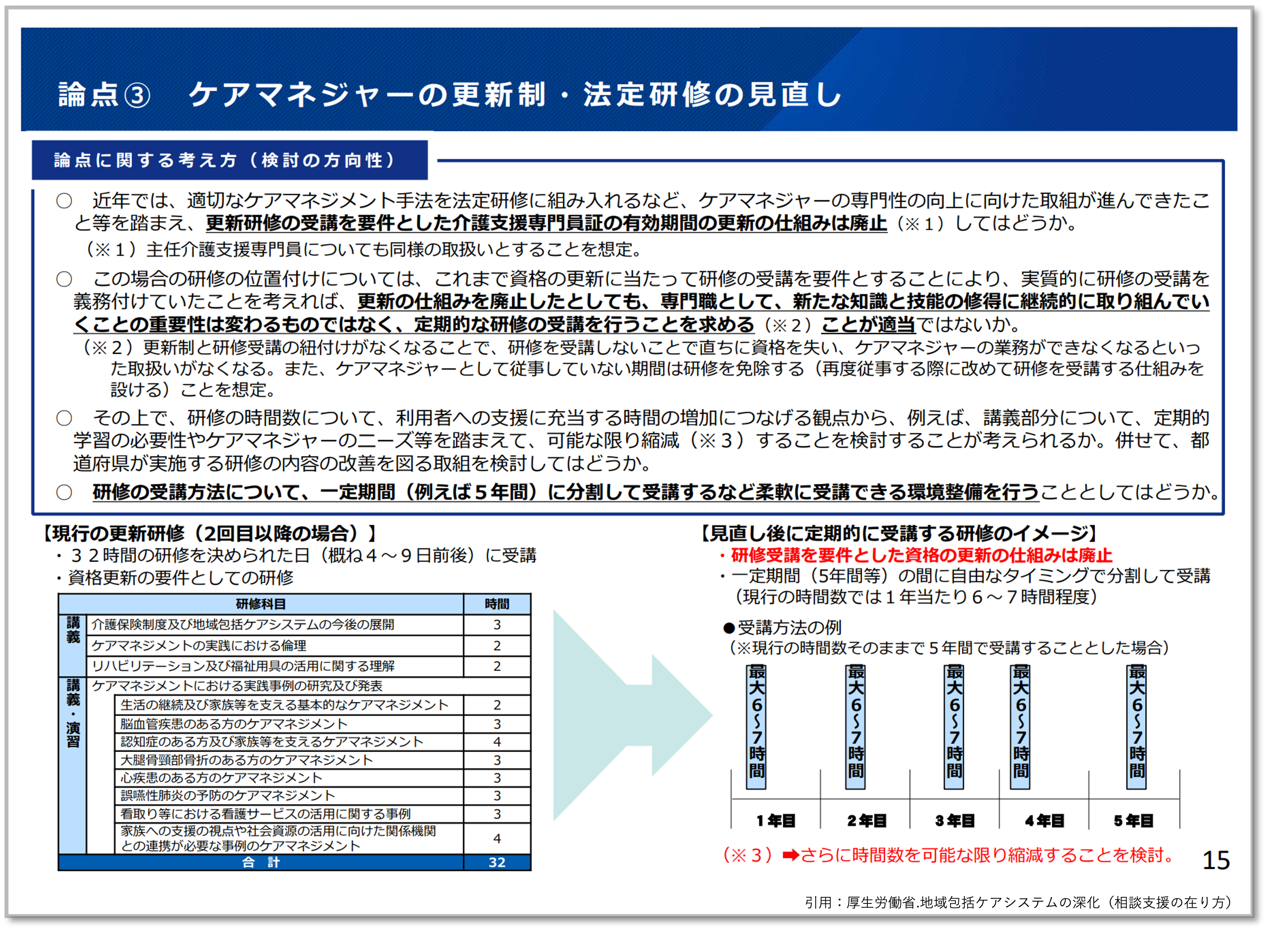厚生労働省は、この状況を改善するため、更新研修の在り方を抜本的に見直すことを提案しました。
