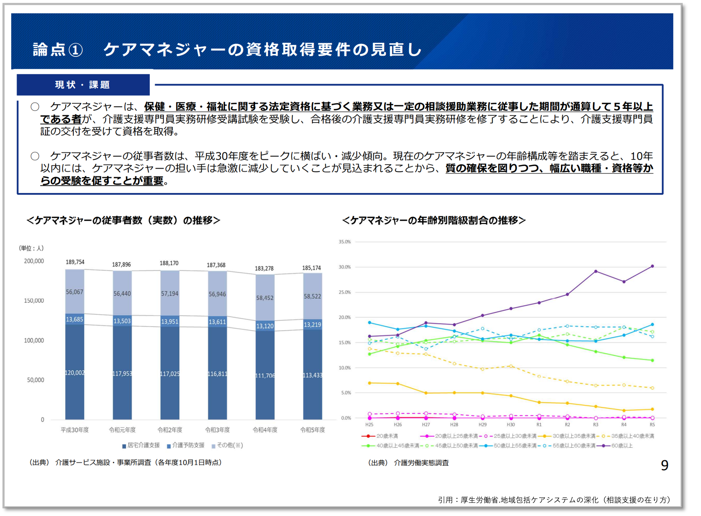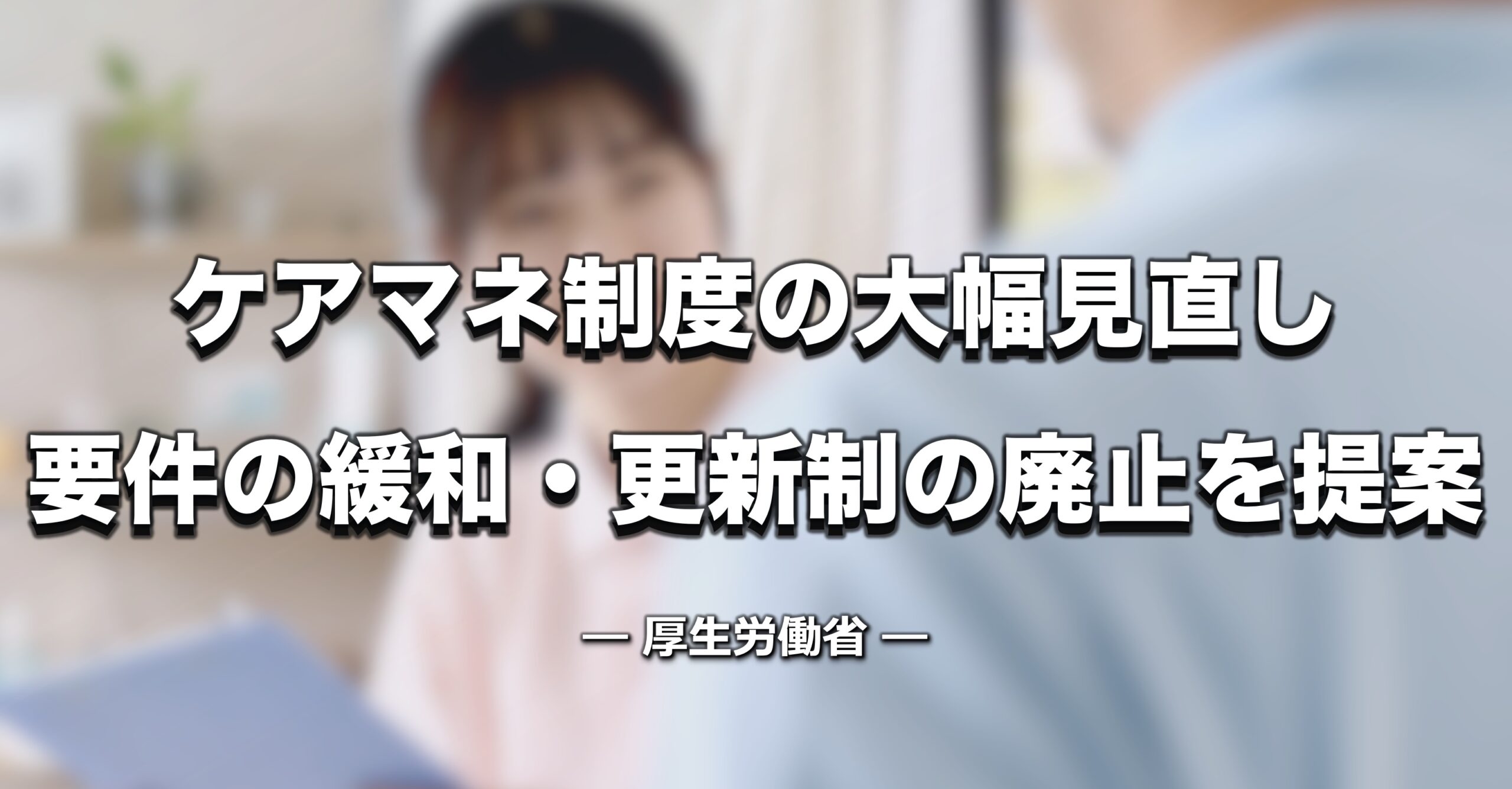 厚生労働省は、深刻な人材不足と業務の複雑化が進む介護支援専門員(ケアマネジャー)の業務体制および資格制度について、抜本的な見直し案を社会保障審議会介護保険部会で提案しました。