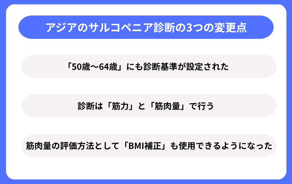 今回の改訂では、対象となる年齢や診断の流れ、筋肉量の測定方法などにいくつかの変更が加えられています。