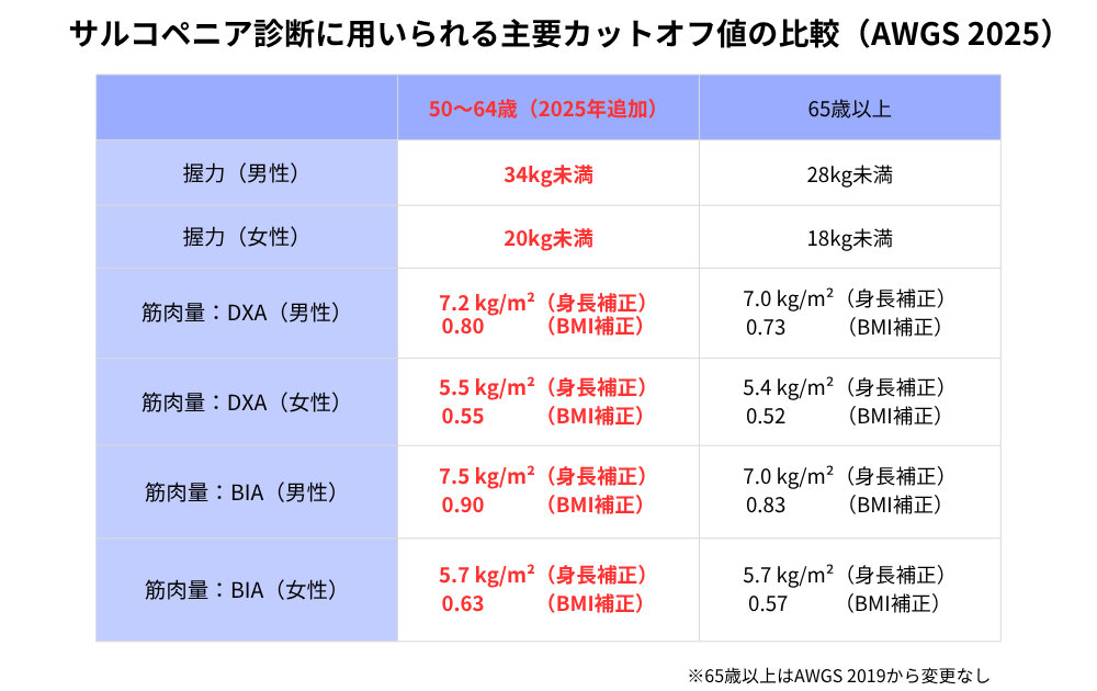 50〜64歳の中年層に対しても診断基準が設定され、より早い段階からの評価が可能となりました。中年期から筋力や筋肉量の低下が始まることを考えれば、納得のいく変更です。