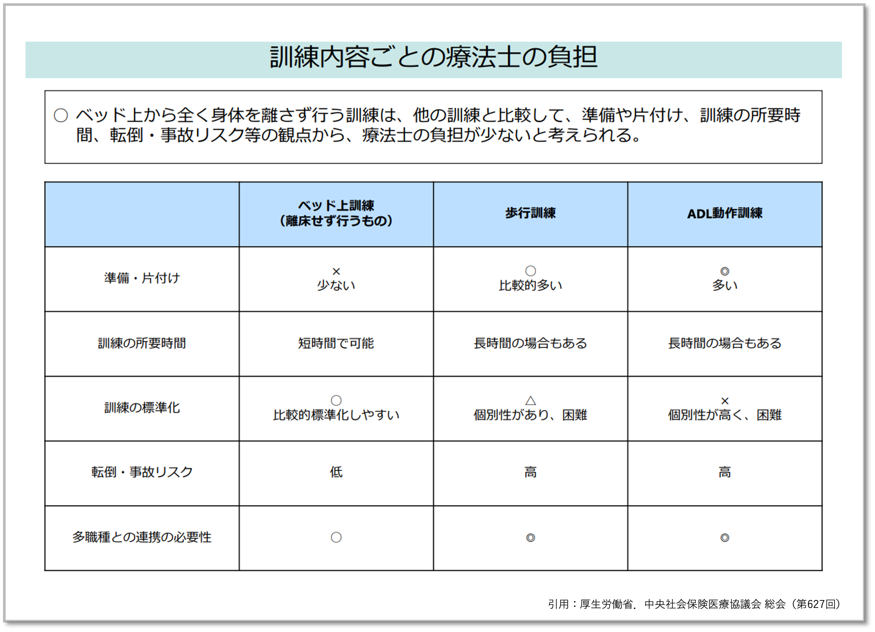 この中では、ベッド上から離床せずに行う訓練(床上リハ)は、歩行訓練やADL動作訓練と比較して、準備や片付け、所要時間、転倒・事故リスクの観点から、療法士の負担が少ないとの考えが示されました。
