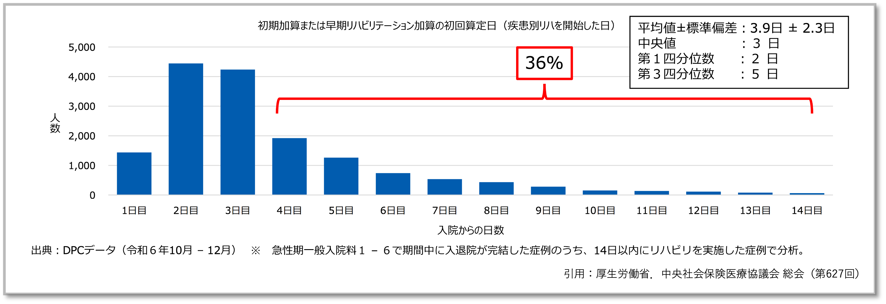 これについて、厚生労働省がDPCデータを分析したところ、14日以内に初期加算等を算定した患者のうち、3日以内に疾患別リハビリテーションの初回介入ができていない患者は36%を占めていることが判明しています。