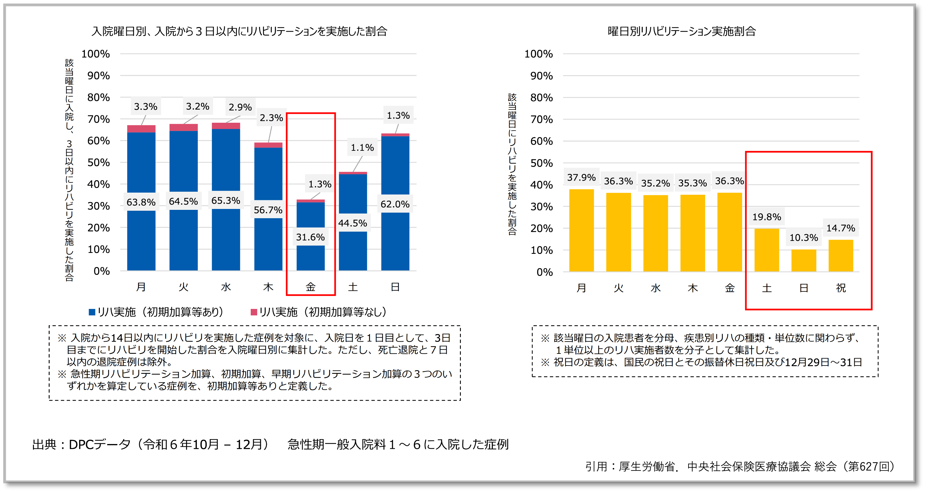 急性期一般病棟において、入院した曜日が金曜日の場合、入院後3日以内にリハビリテーションを開始できた割合が最も低いという実態が示されました。