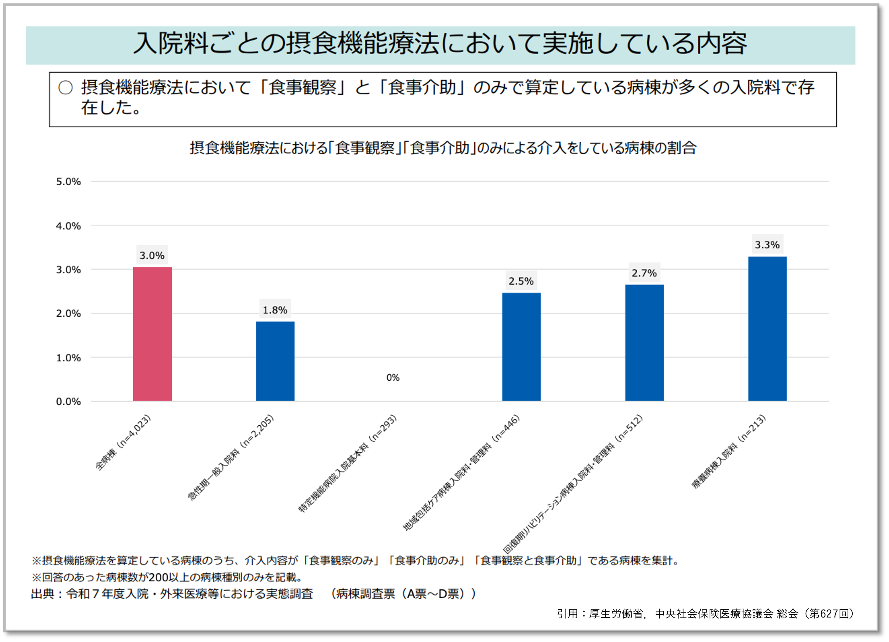 しかし、摂食機能療法を算定している病棟のうち一部の病棟では、介入内容が食事観察や介助にとどまるケースも報告されています。